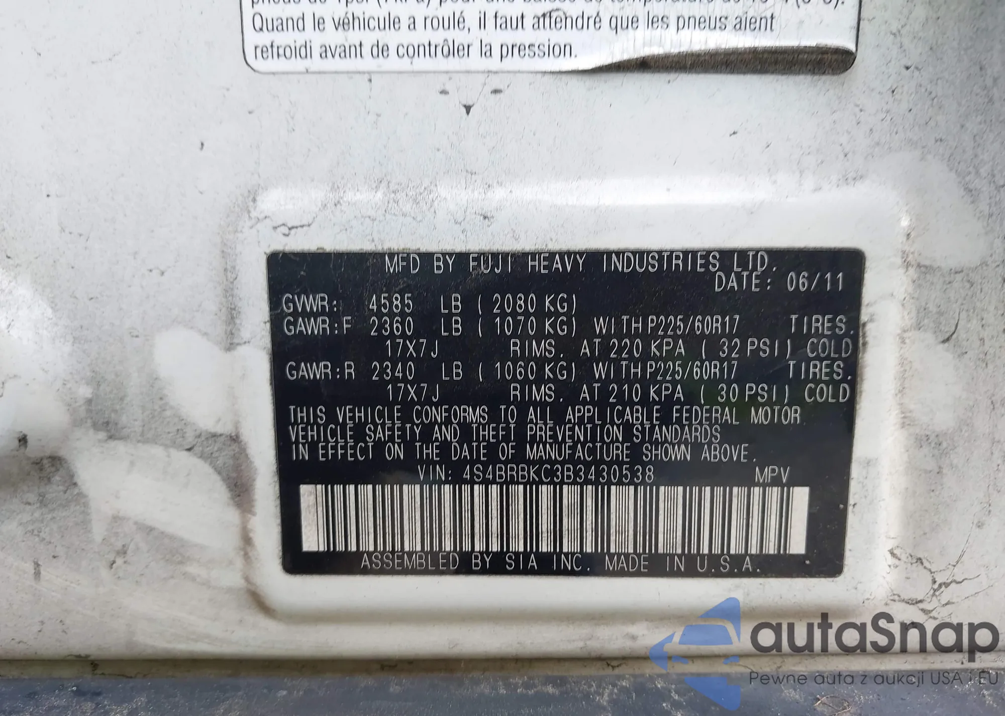 LOT: 44406653 VIN: 4S4BRBKC3B3430538