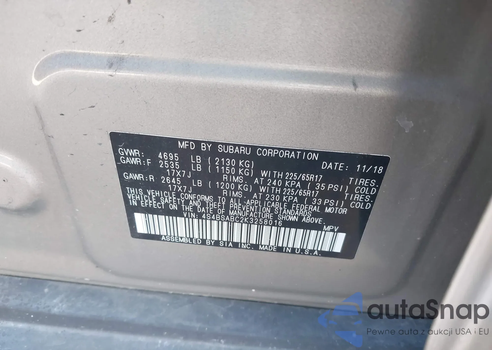• VIN 4S4BSABC2K3258016