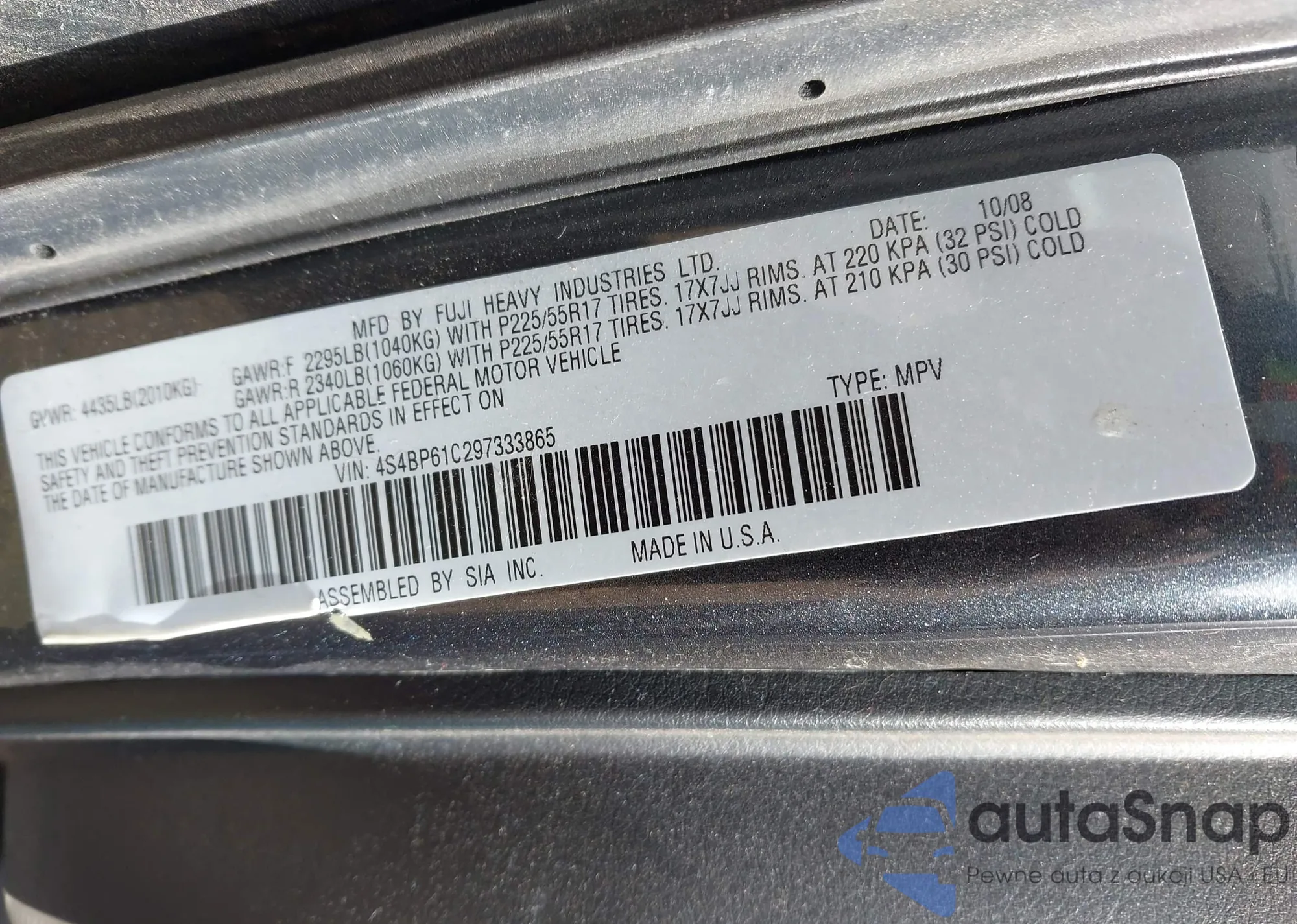 • VIN 4S4BP61C297333865