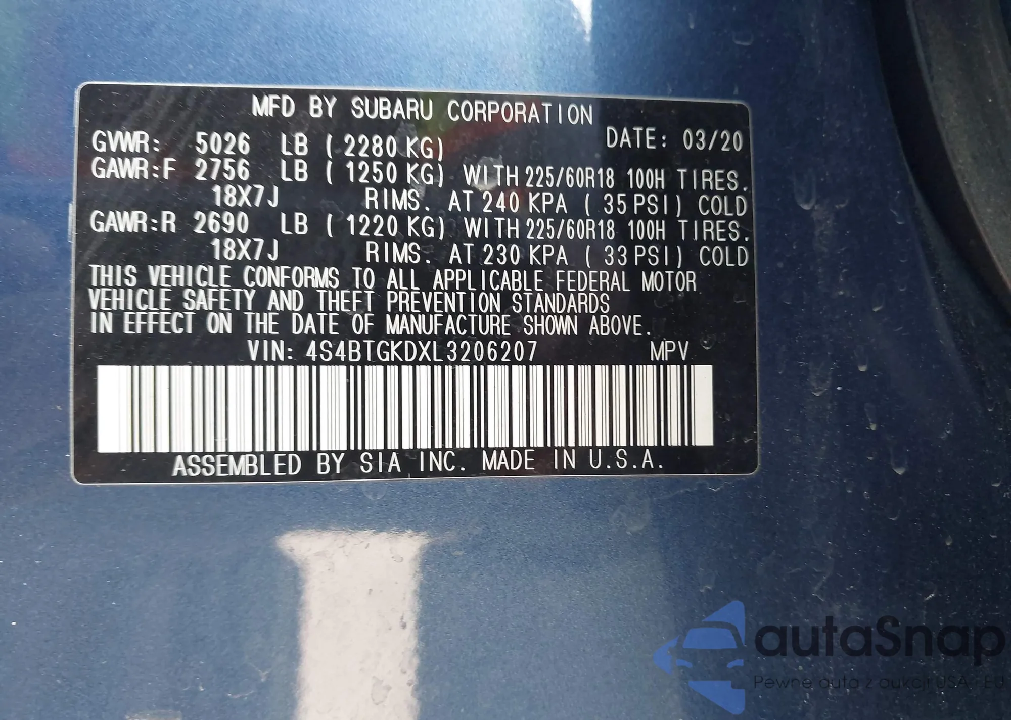 • VIN 4S4BTGKDXL3206207
