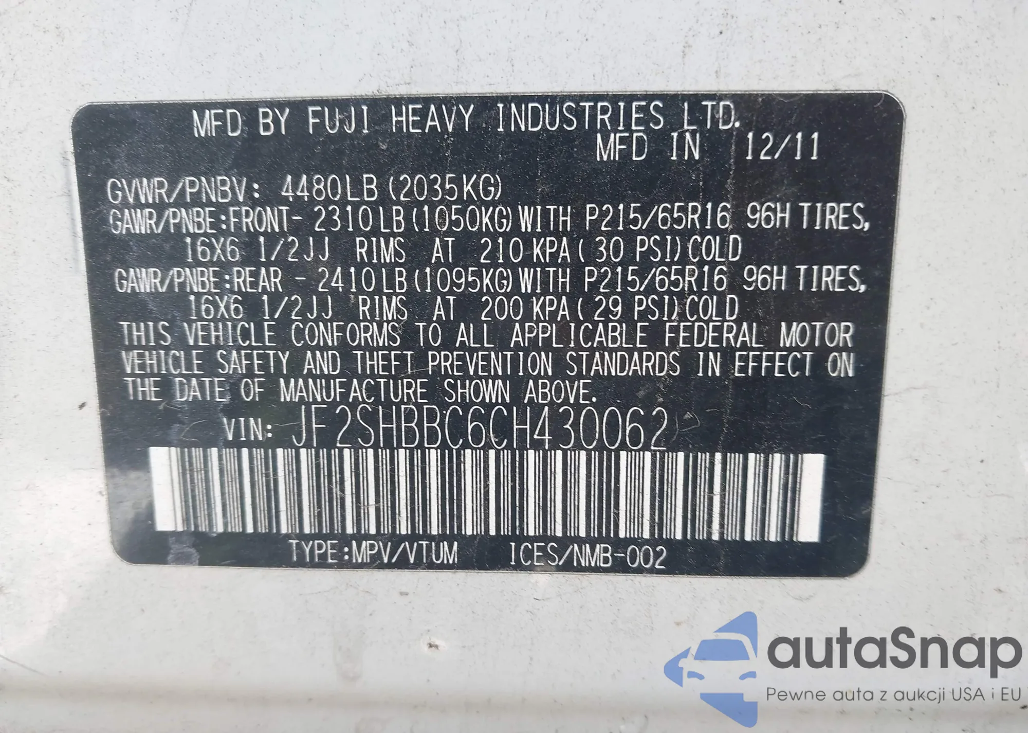 • VIN JF2SHBBC6CH430062