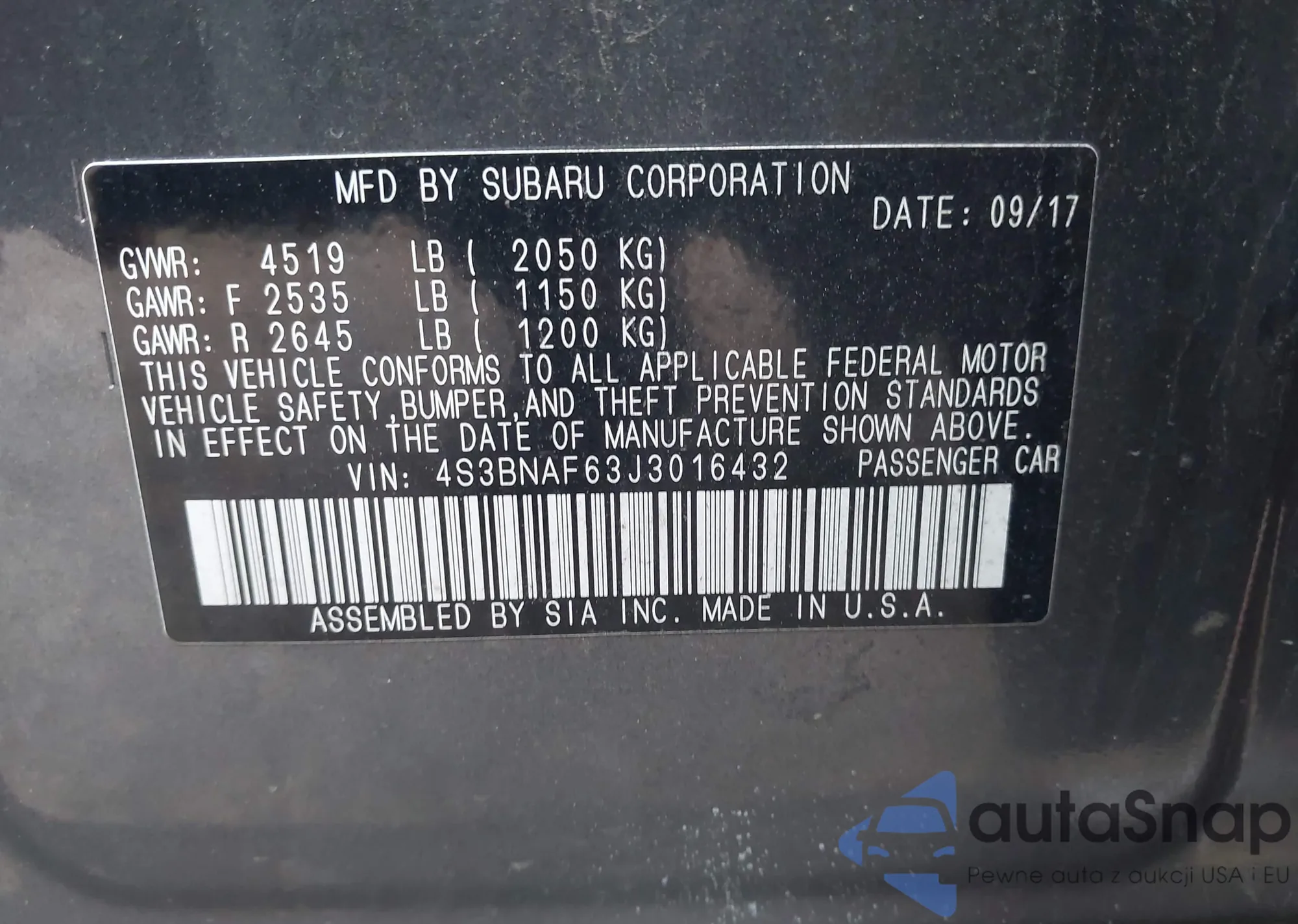 • VIN 4S3BNAF63J3016432