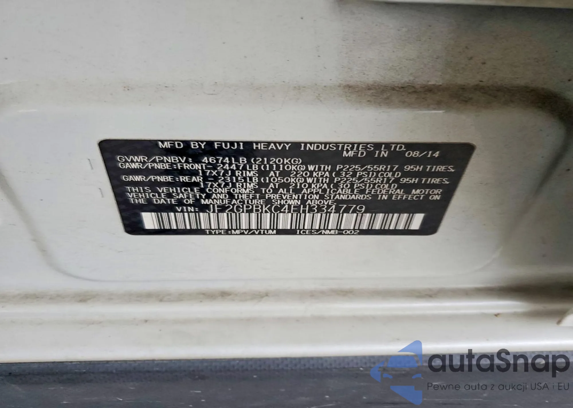 LOT: 72634005 VIN: JF2GPBKC4EH334779