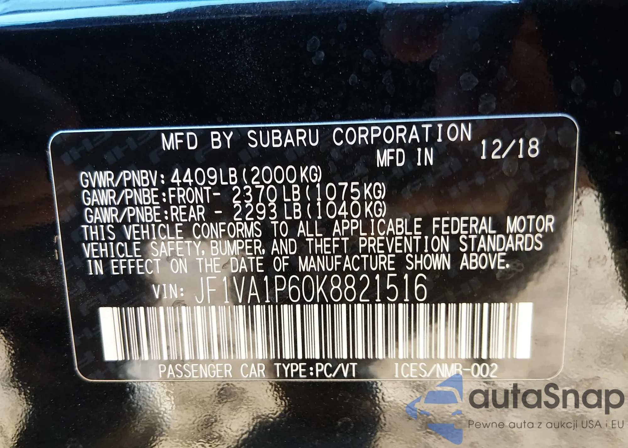 LOT: 43981598 VIN: JF1VA1F67K8805136