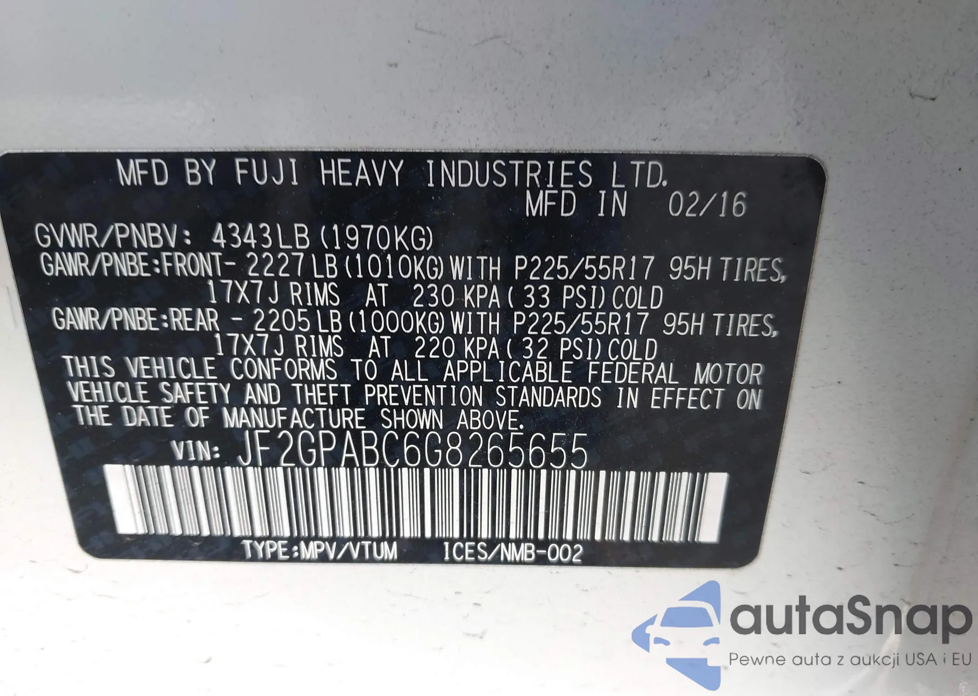 LOT: 44350332 VIN: JF2GPABC6G8265655