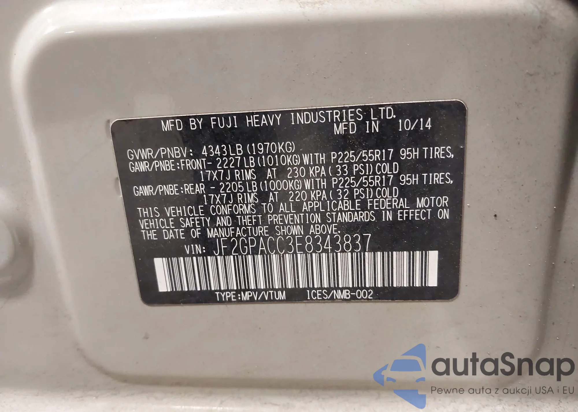 • VIN JF2GPACC3E8343837