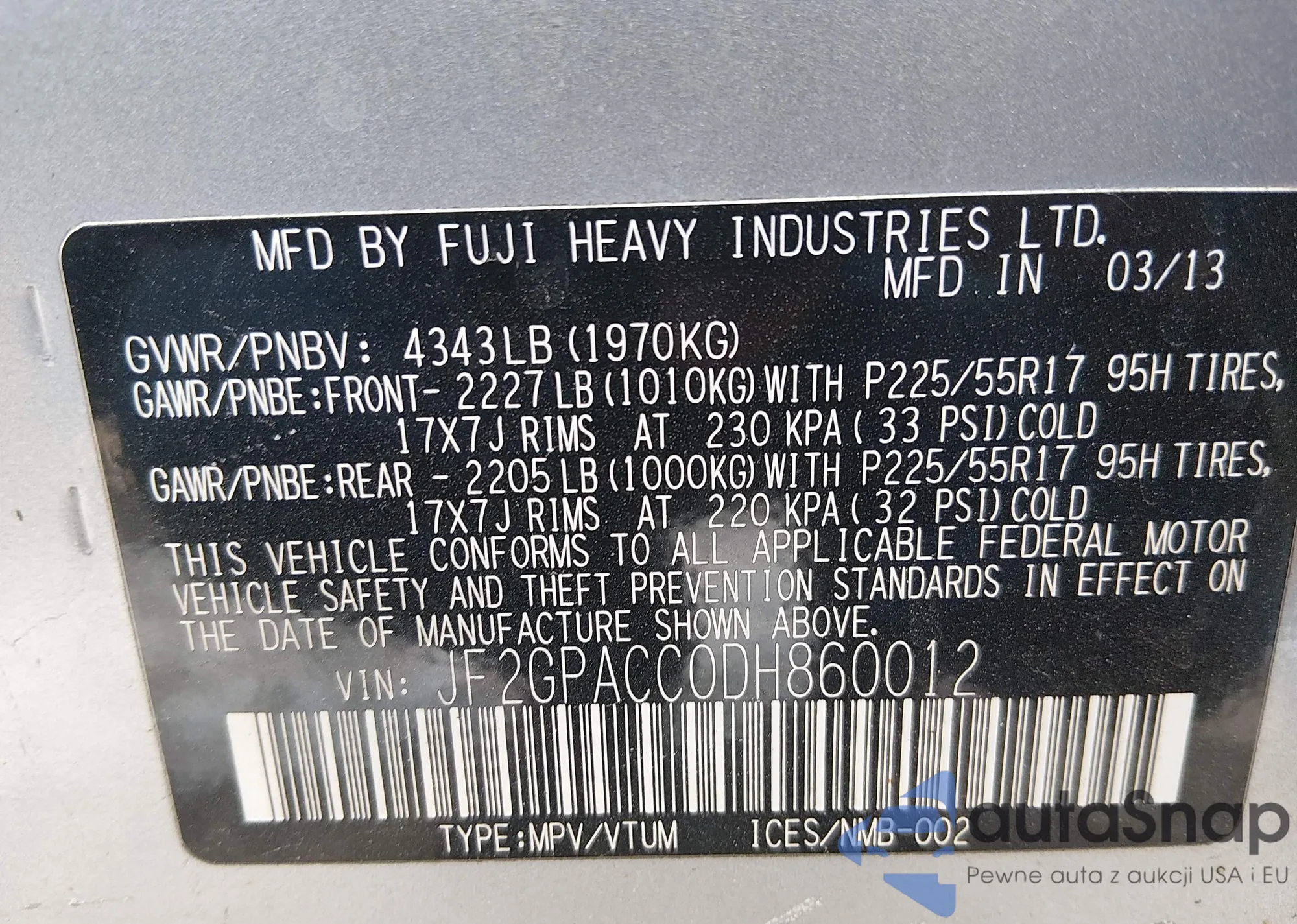 LOT: 44376504 VIN: JF2GPACC0DH860012