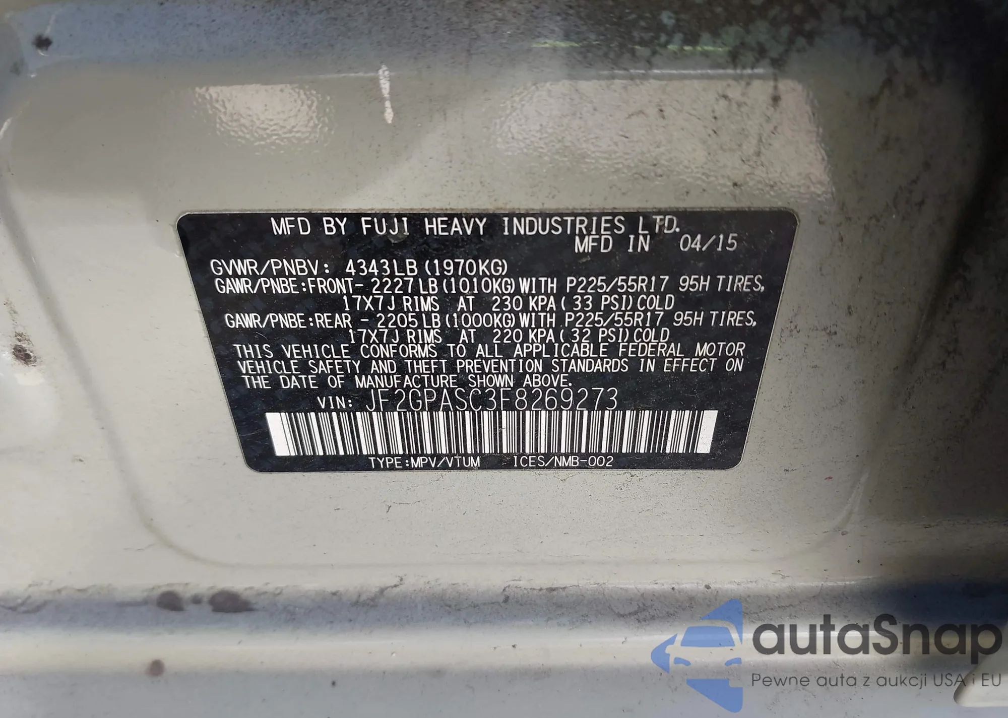 • VIN JF2GPASC3F8269273