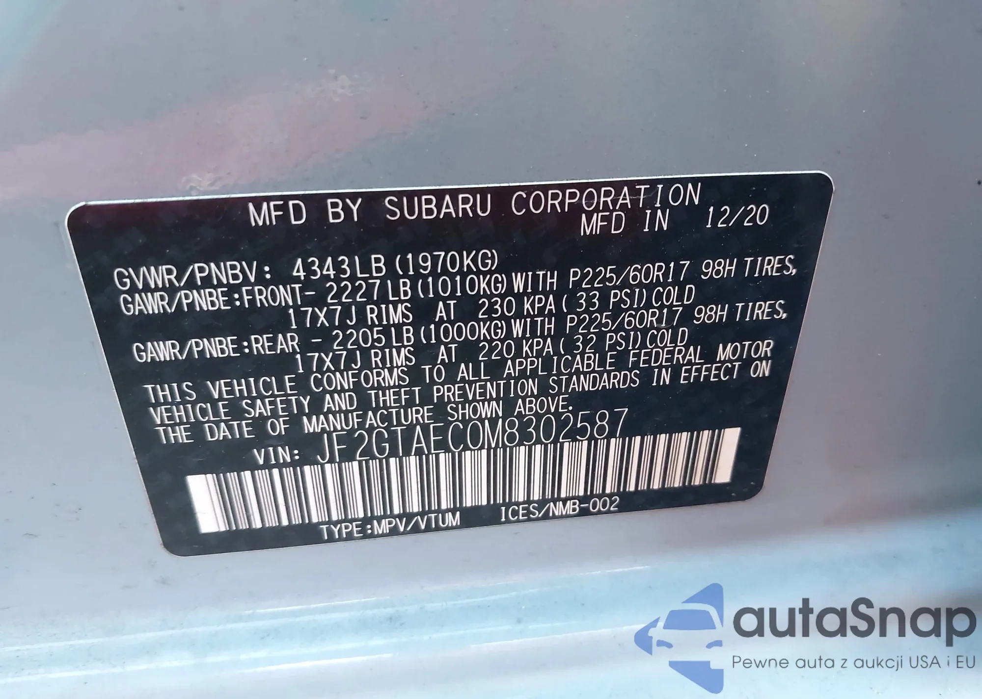 LOT: 44381448 VIN: JF2GTAEC0M8302587