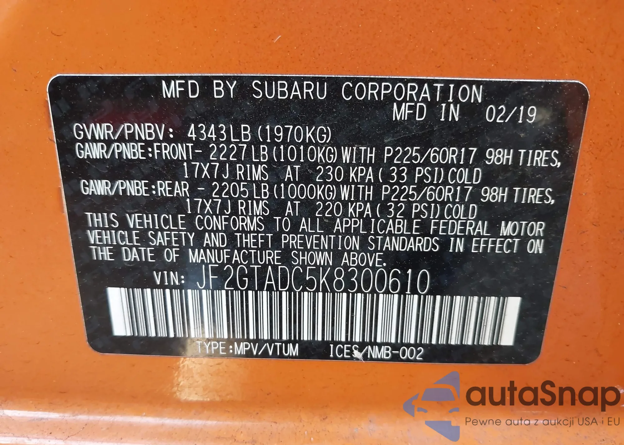LOT: 44430929 VIN: JF2GTADC5KH270279