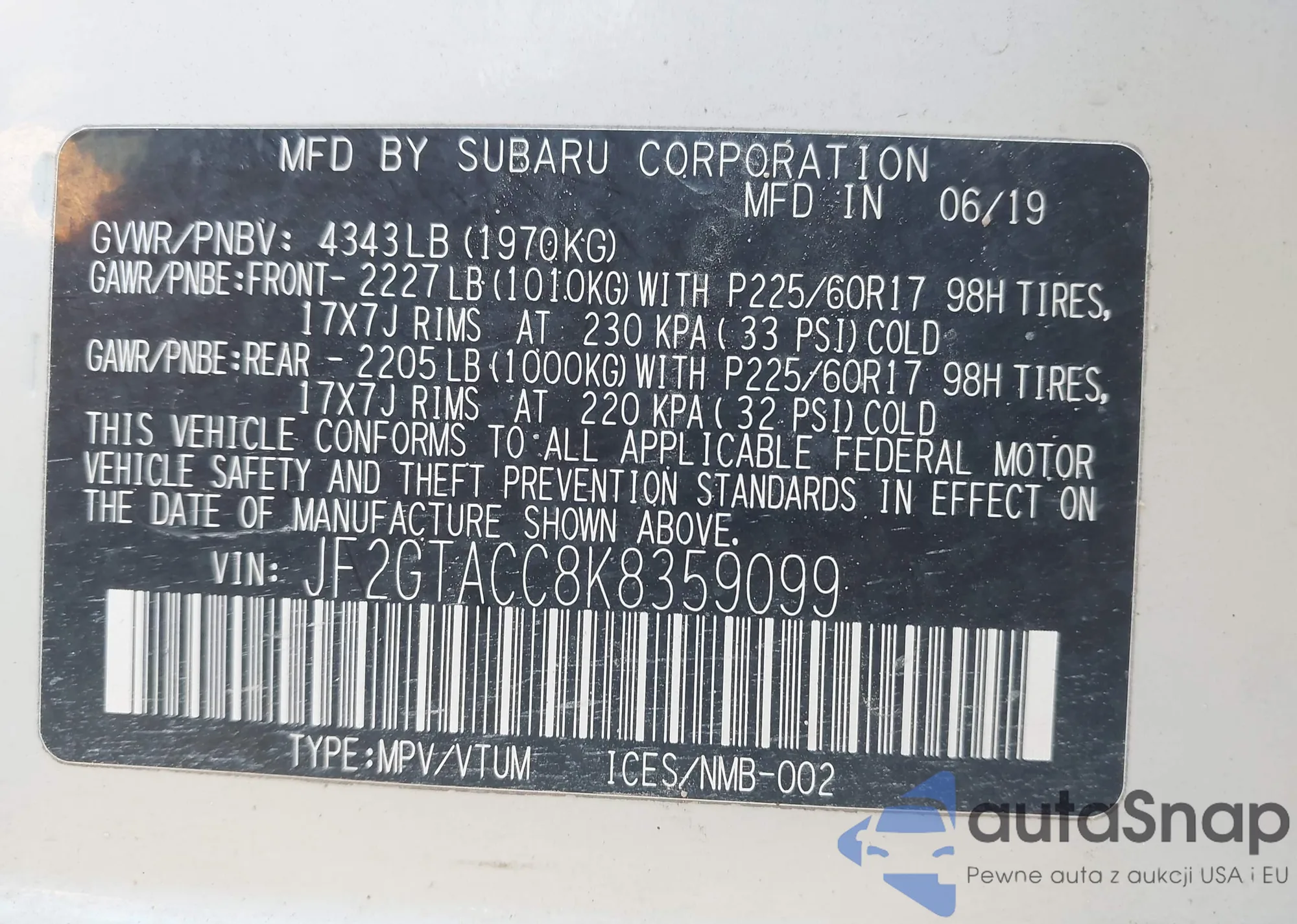 • VIN JF2GTACC8K8359099