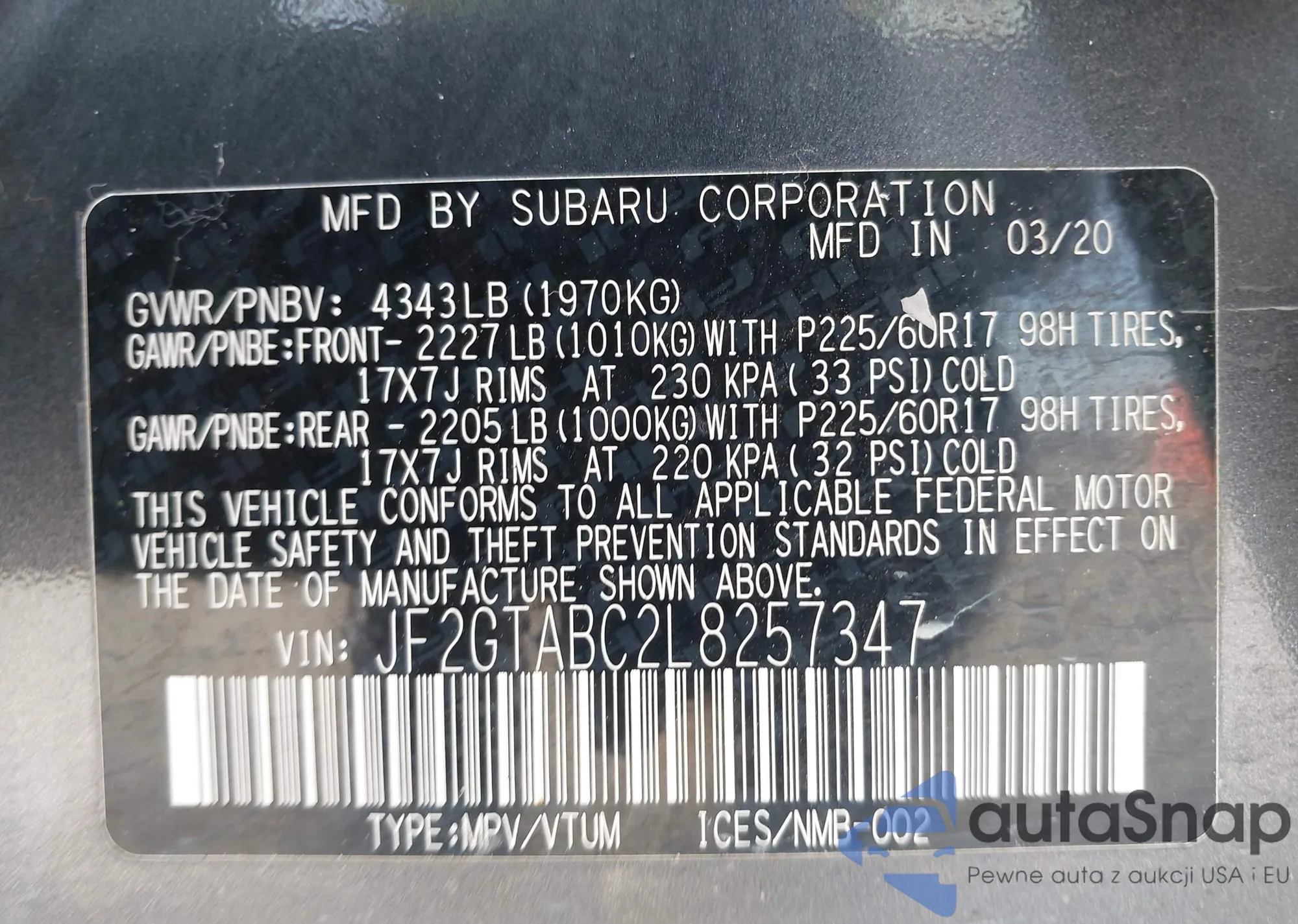 LOT: 44486933 VIN: JF2GTABC2L8257347