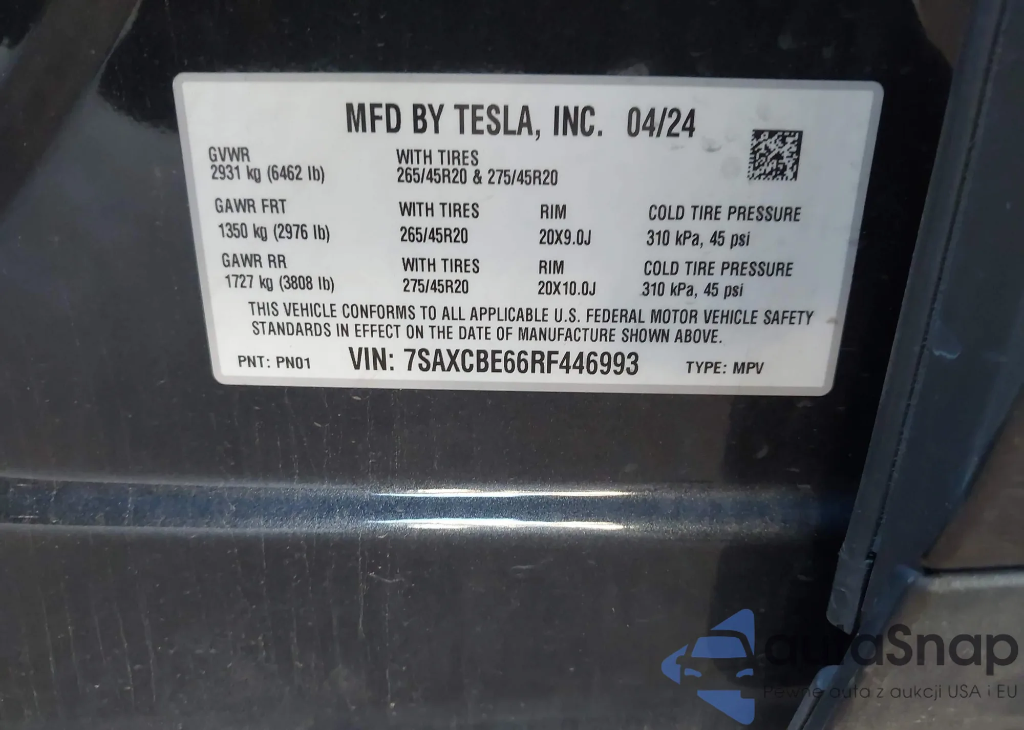 2024 Tesla Model X Plaid Tri Motor All-Wheel Drive z USA, uszkodzony, nr VIN 7SAXCBE66RF446993