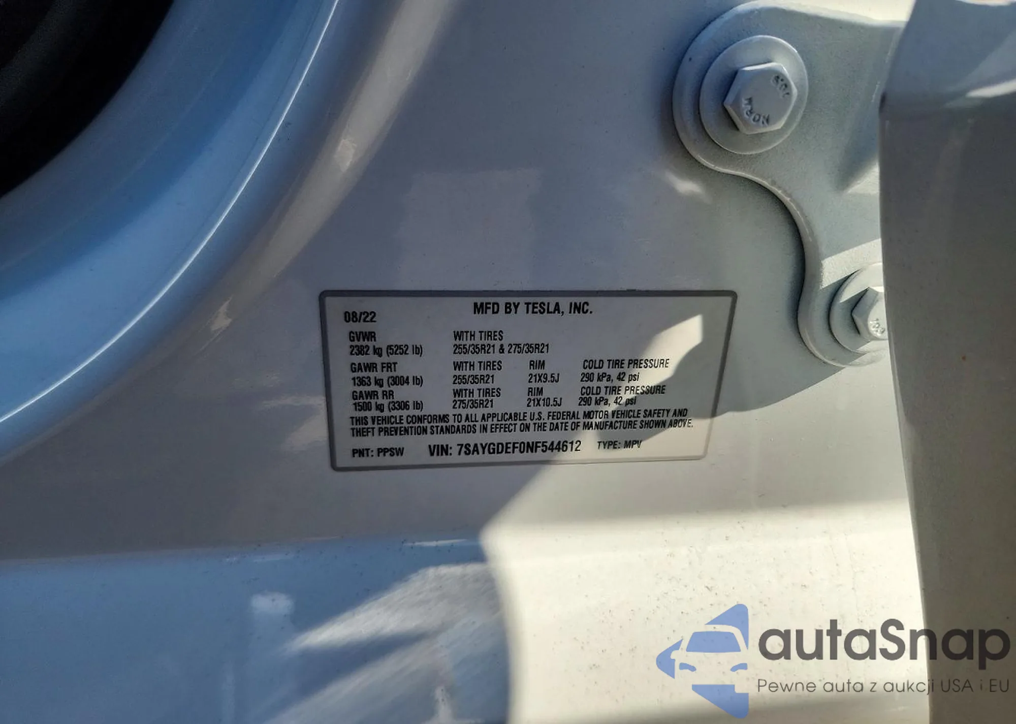 2022 Tesla Model Y z USA, uszkodzony, nr VIN 7SAYGDEF0NF544612