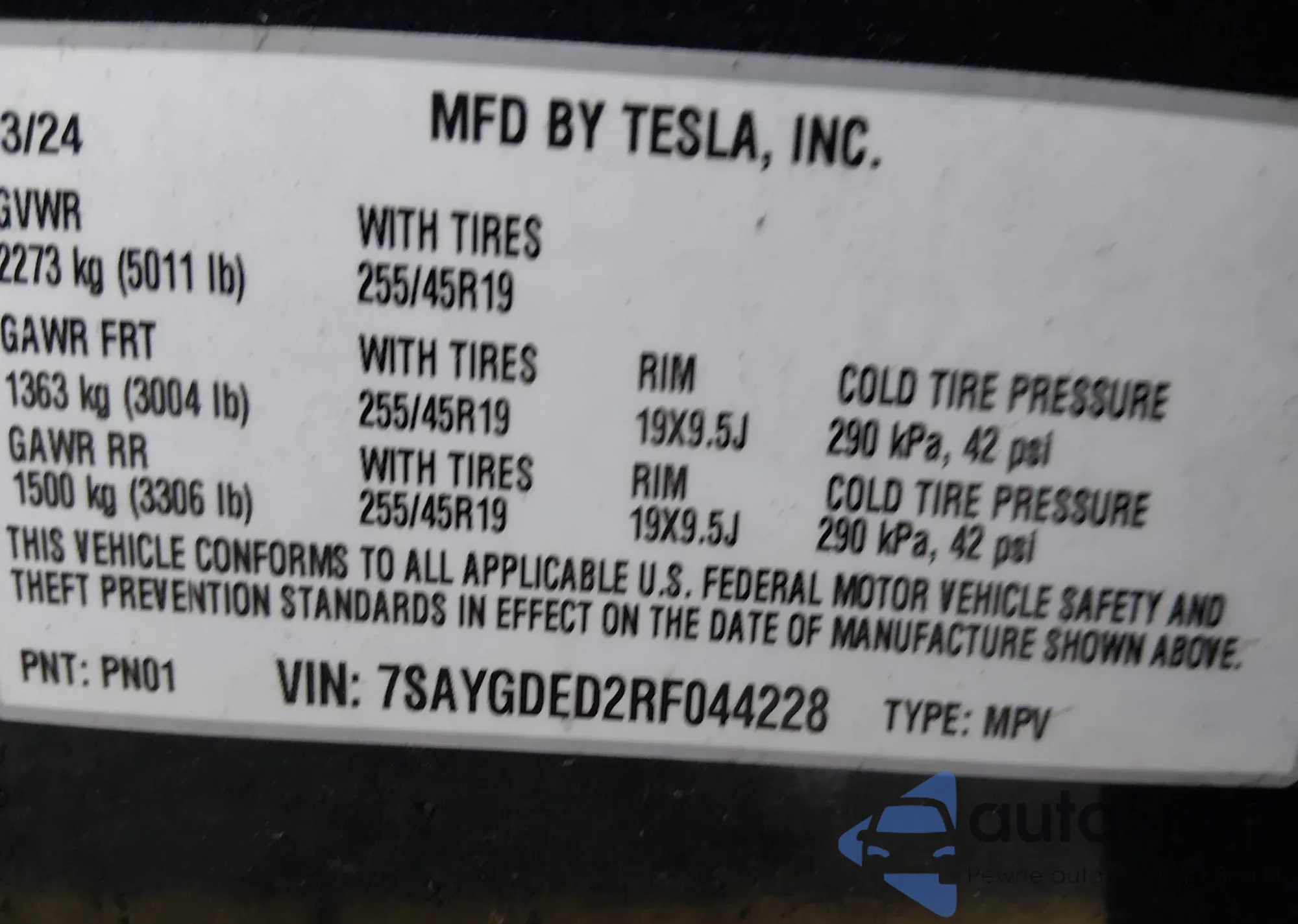 • VIN 5YJ3E1EA6PF438586