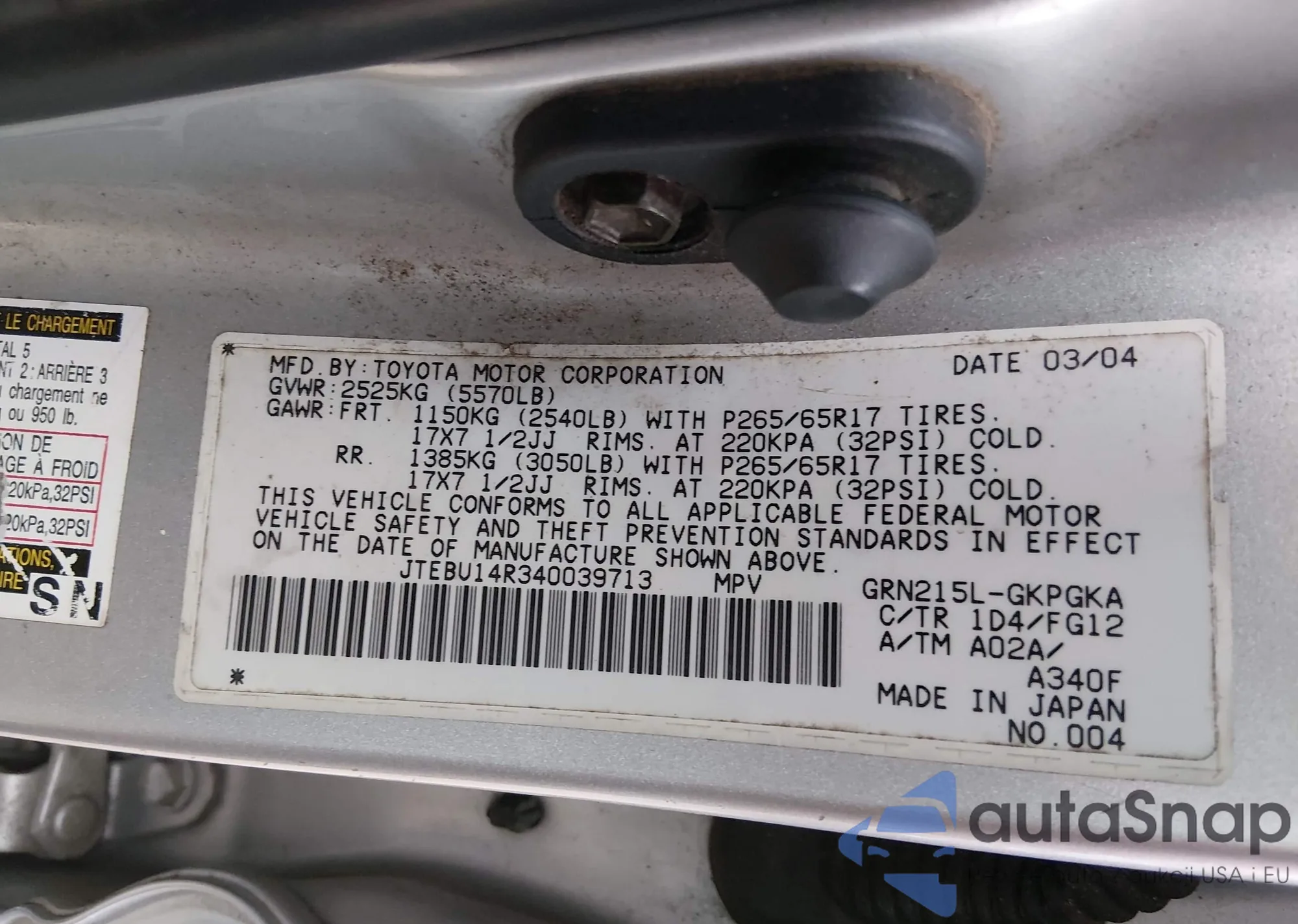 LOT: 44450065 VIN: JTEBU14R340039713