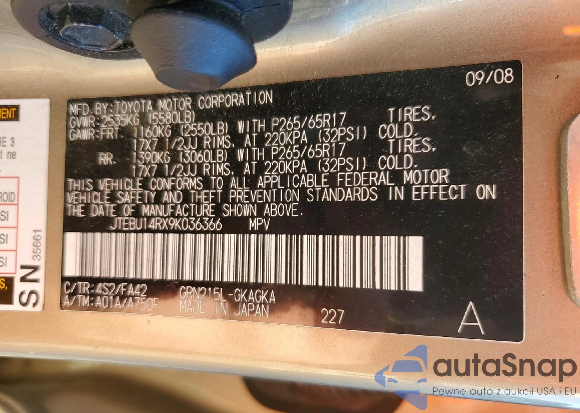 LOT: 72528285 VIN: JTEBU14RX9K036366