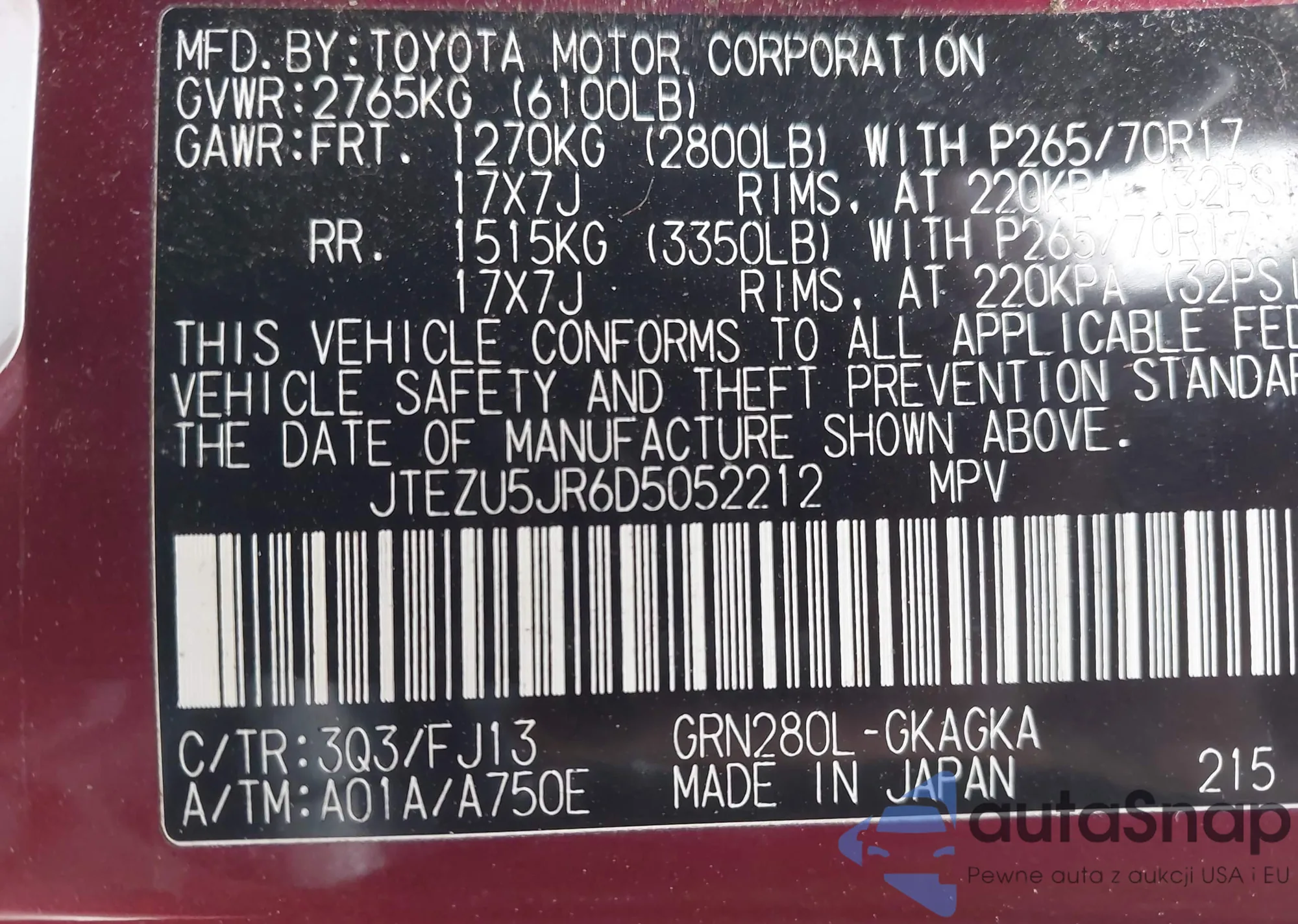 LOT: 43729323 VIN: JTEZU5JR6D5052212