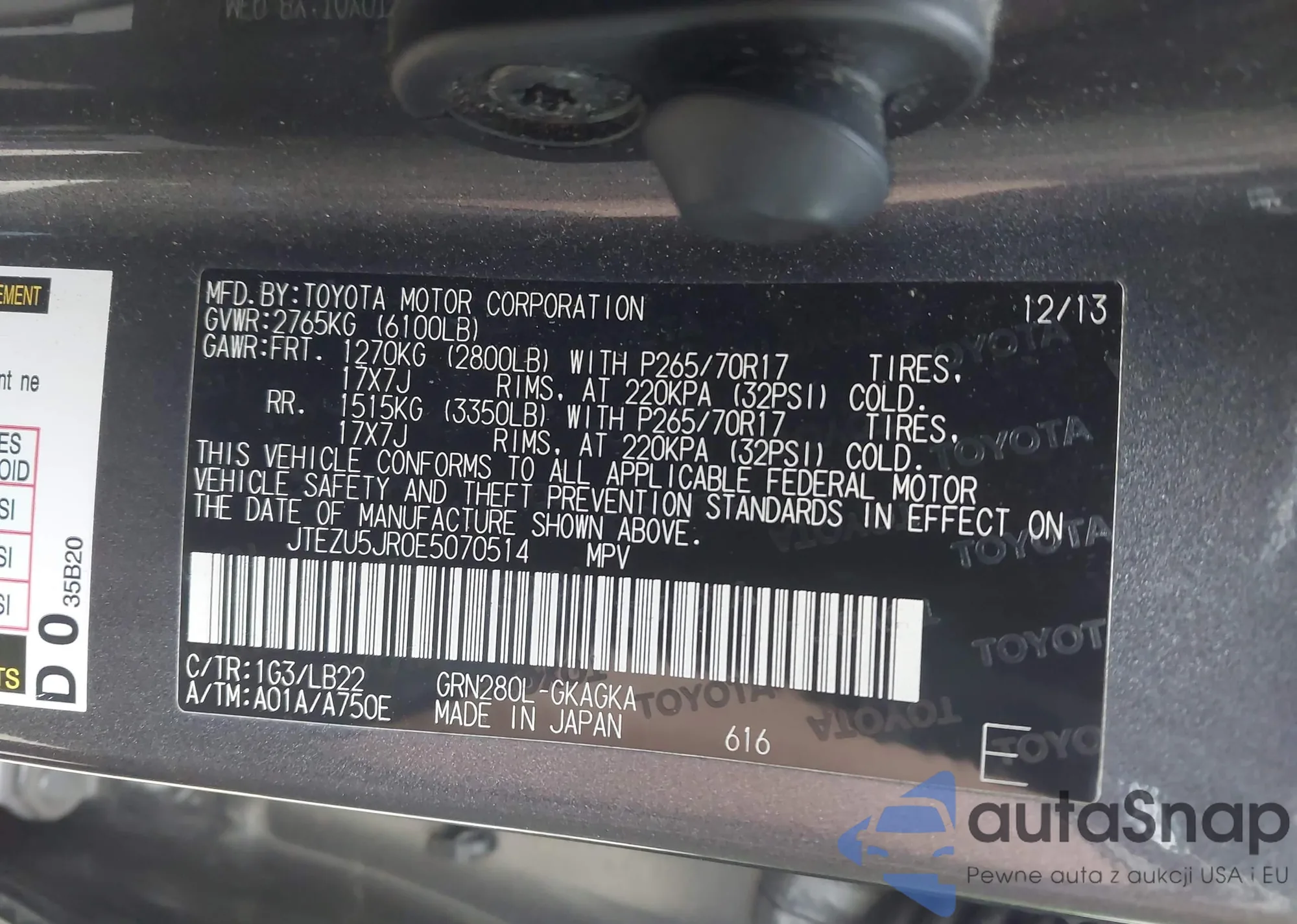 LOT: 44067925 VIN: JTEZU5JR0E5070514