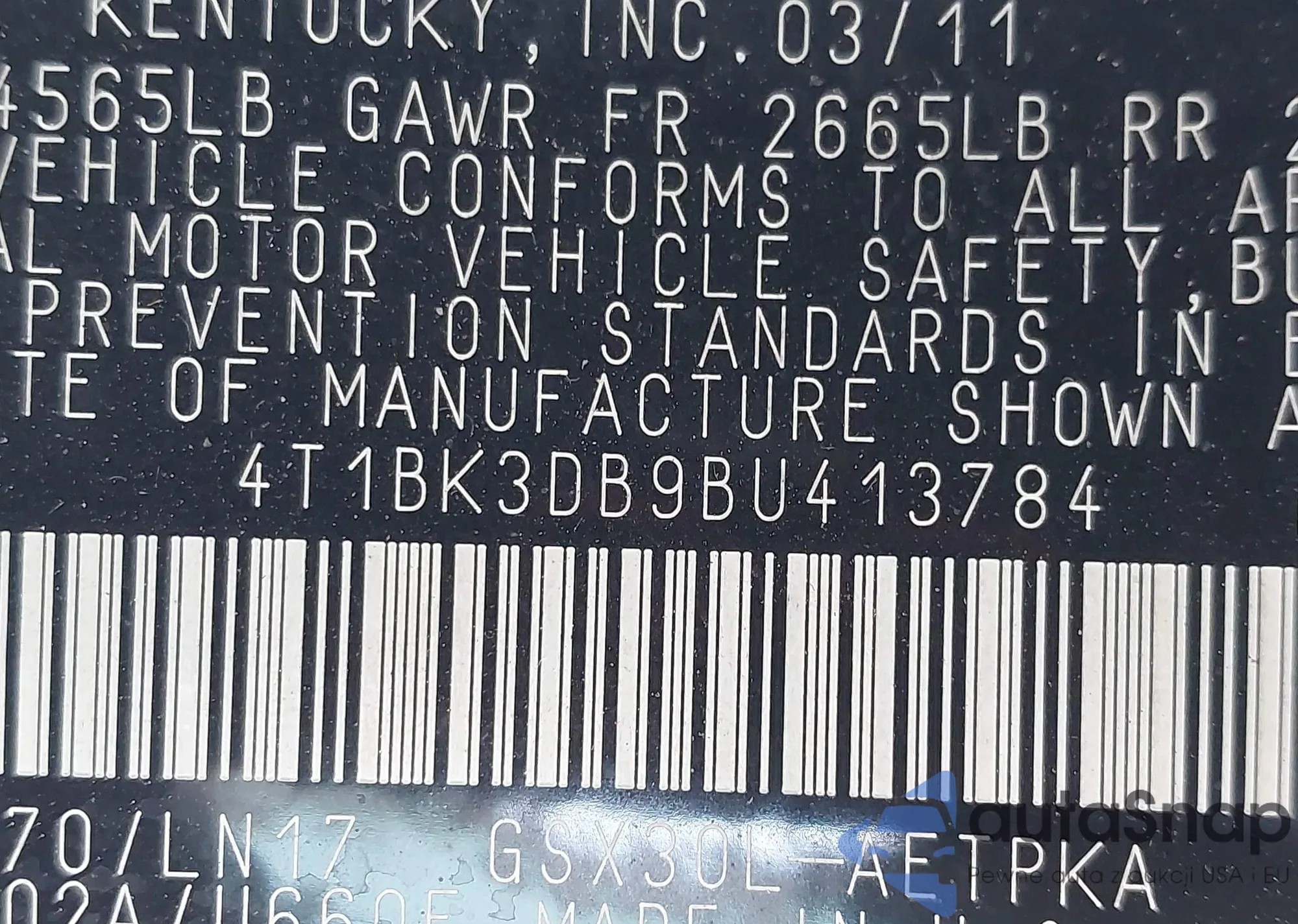 • VIN 4T1BK3DB9BU413784