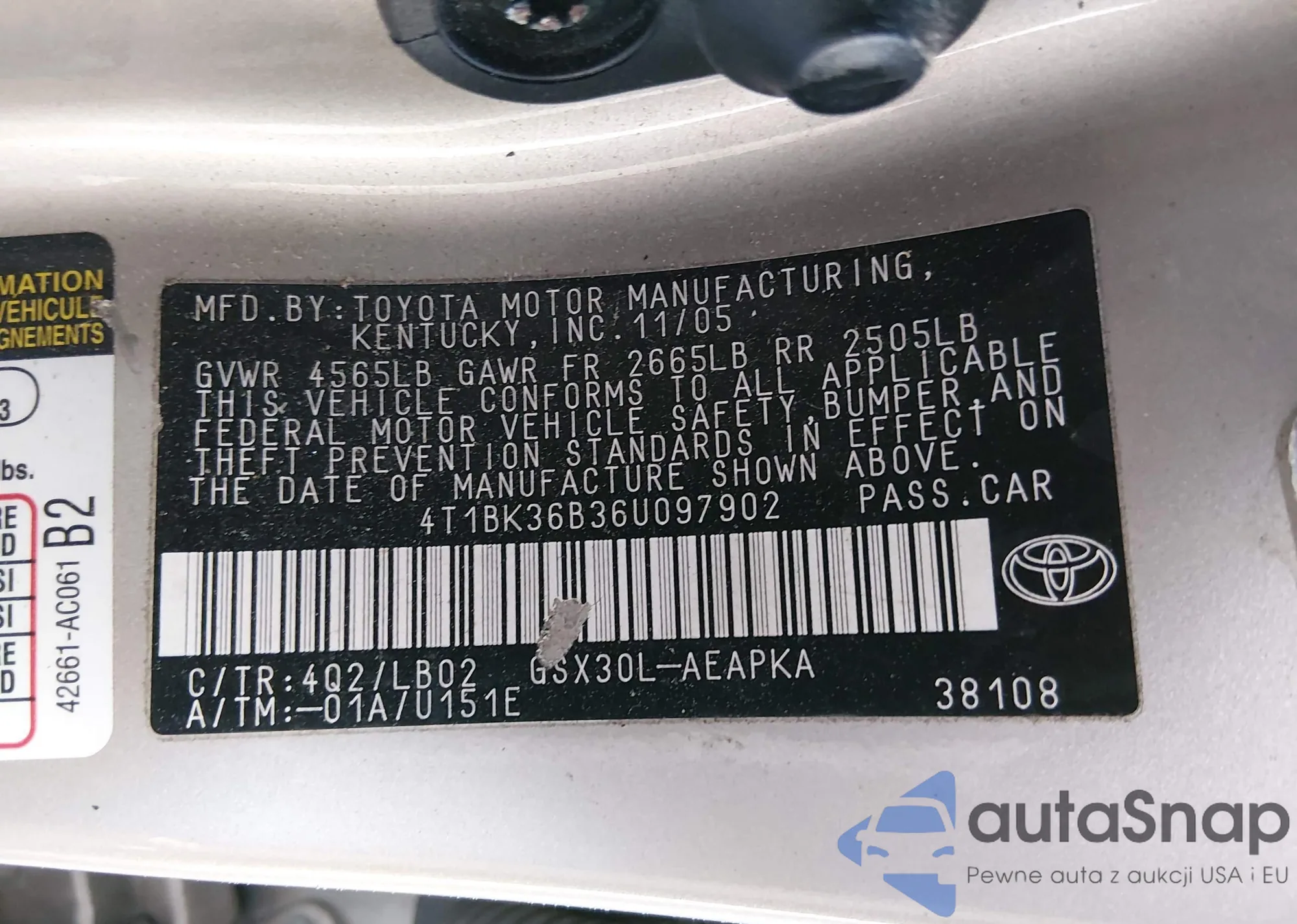 LOT: 44463495 VIN: 4T1BK36B76U085087