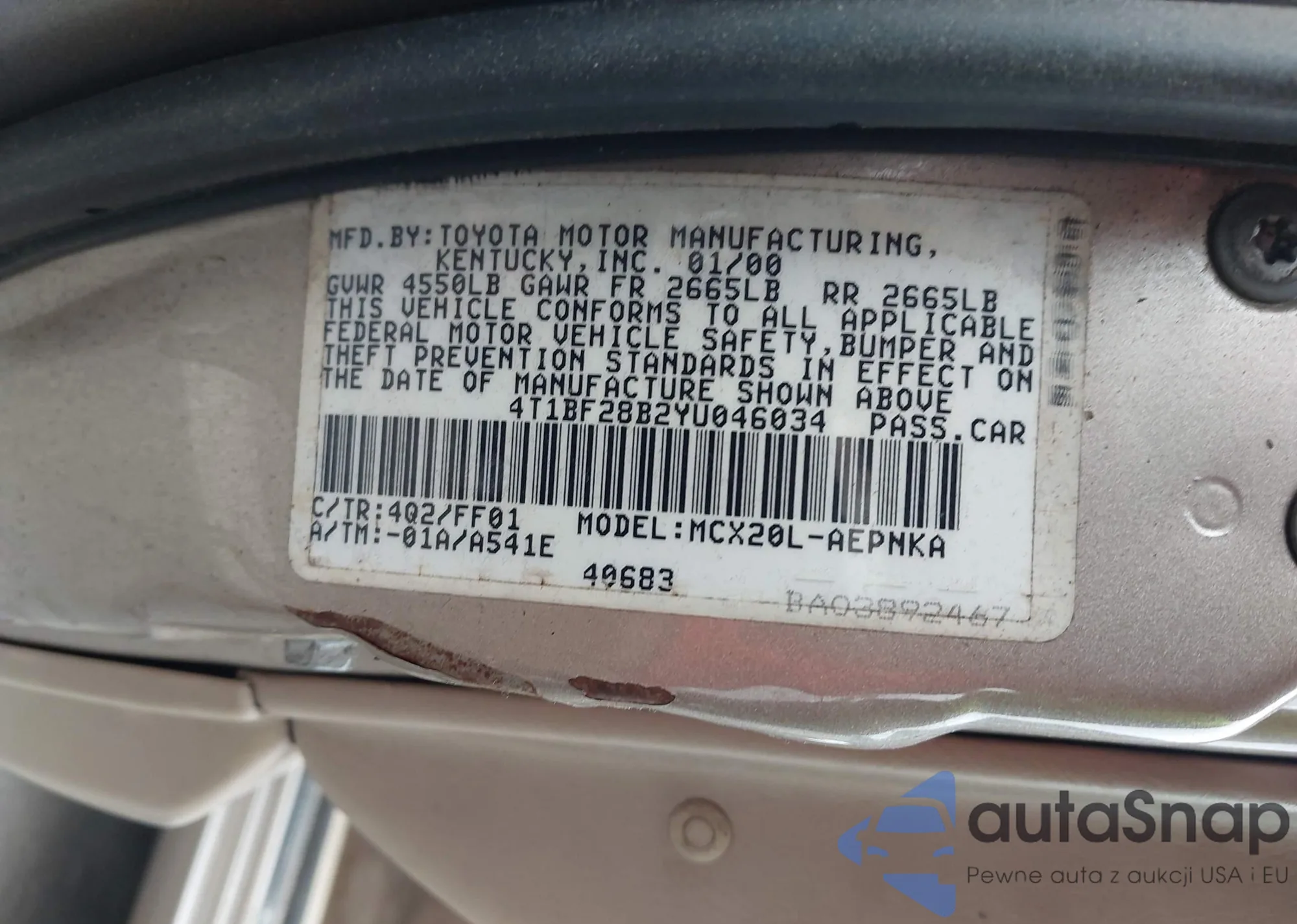 LOT: 44337935 VIN: 4T1BF28B2YU046034