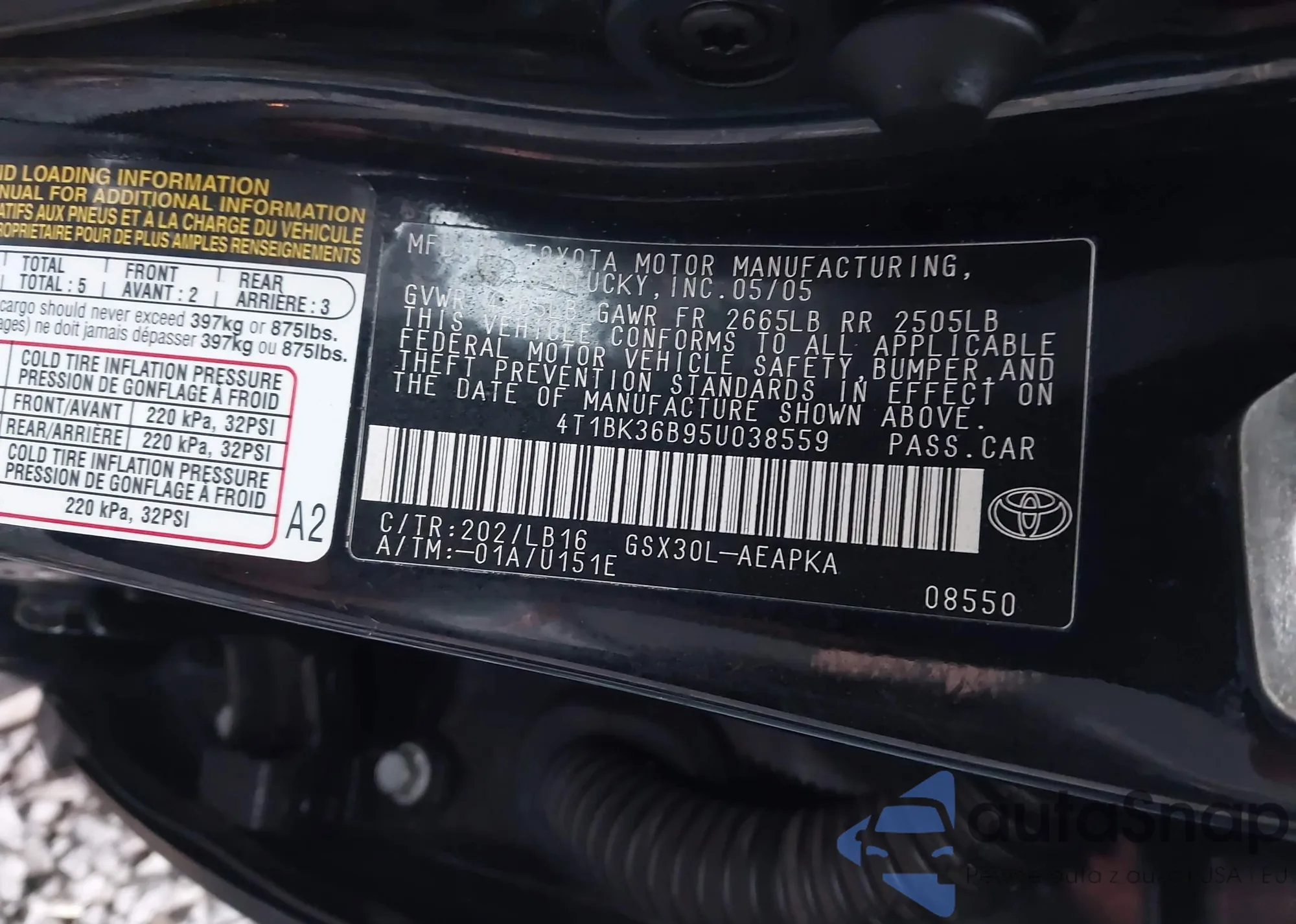 LOT: 44150052 VIN: 4T1BK36B95U038559