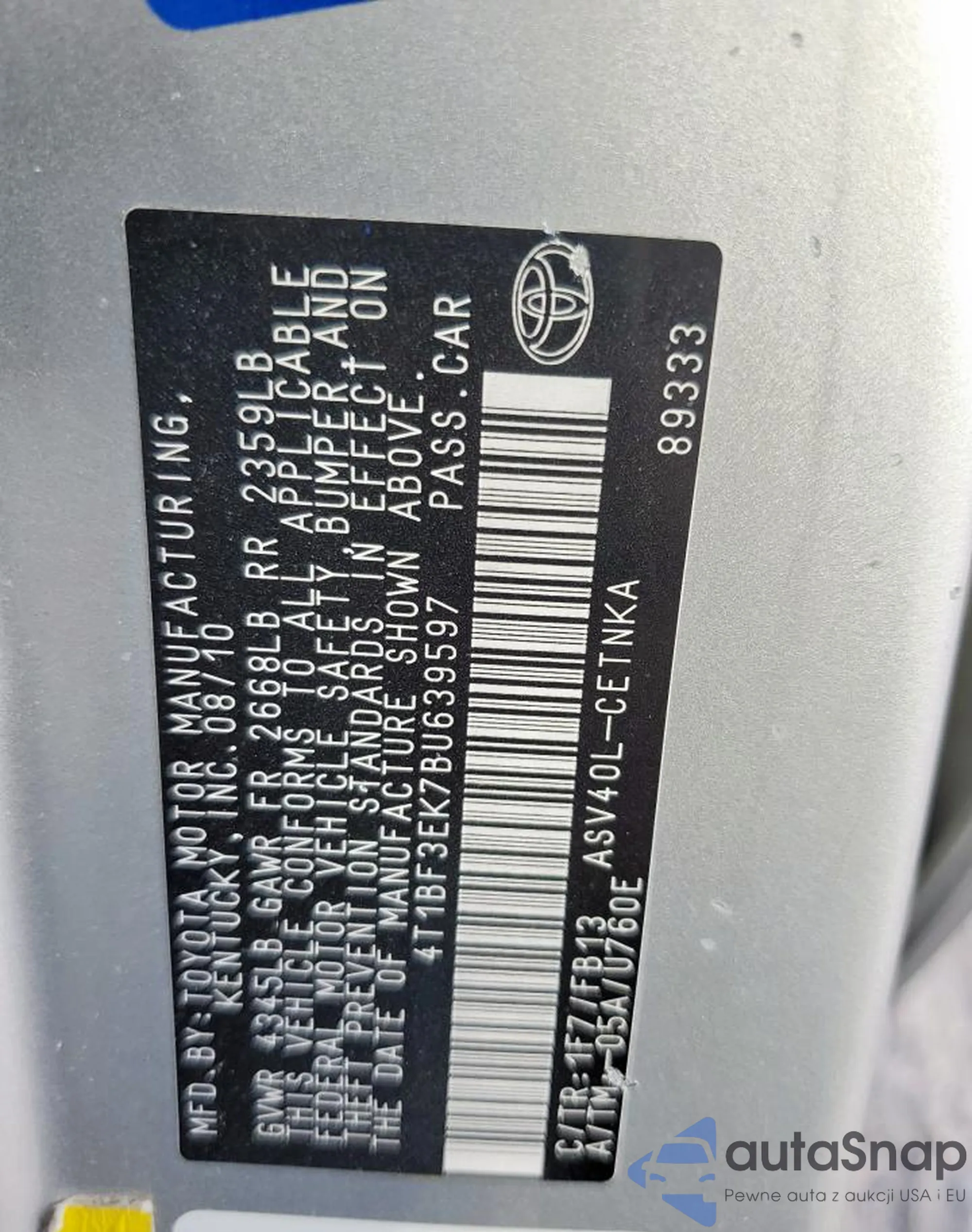 • VIN 4T1BF3EK7BU639597