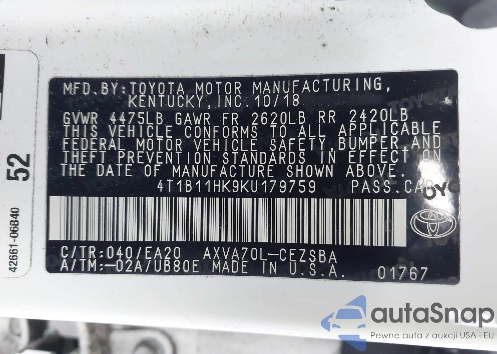 LOT: 43946762 VIN: 4T1B61HK2KU293975