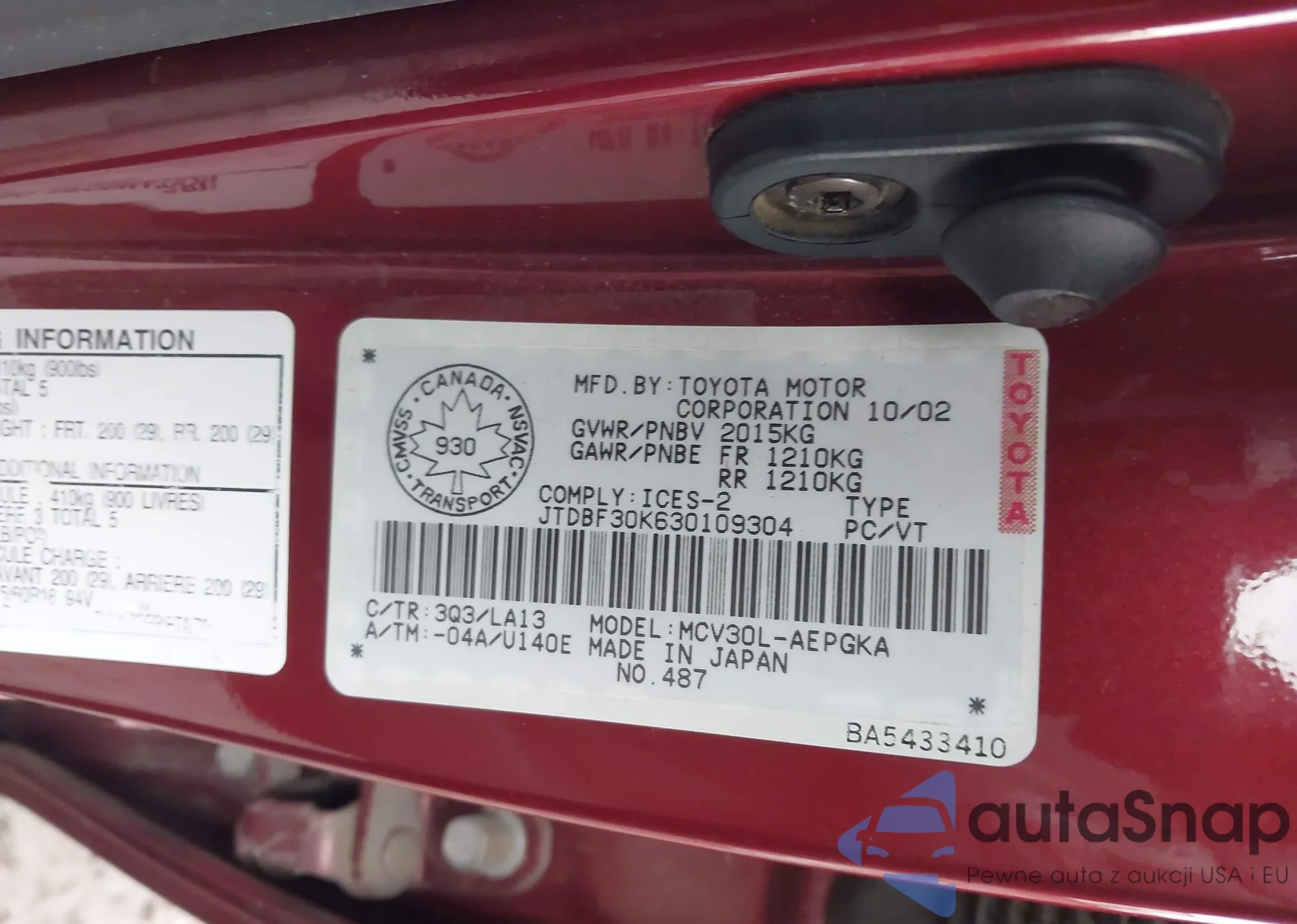 LOT: 44256201 VIN: JTDBF30K630109304