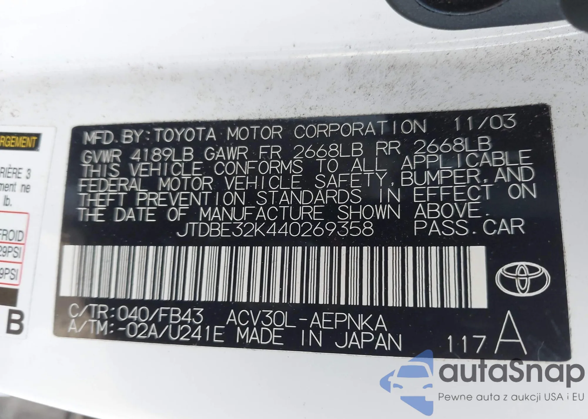 LOT: 44296135 VIN: JTDBE32K440269358