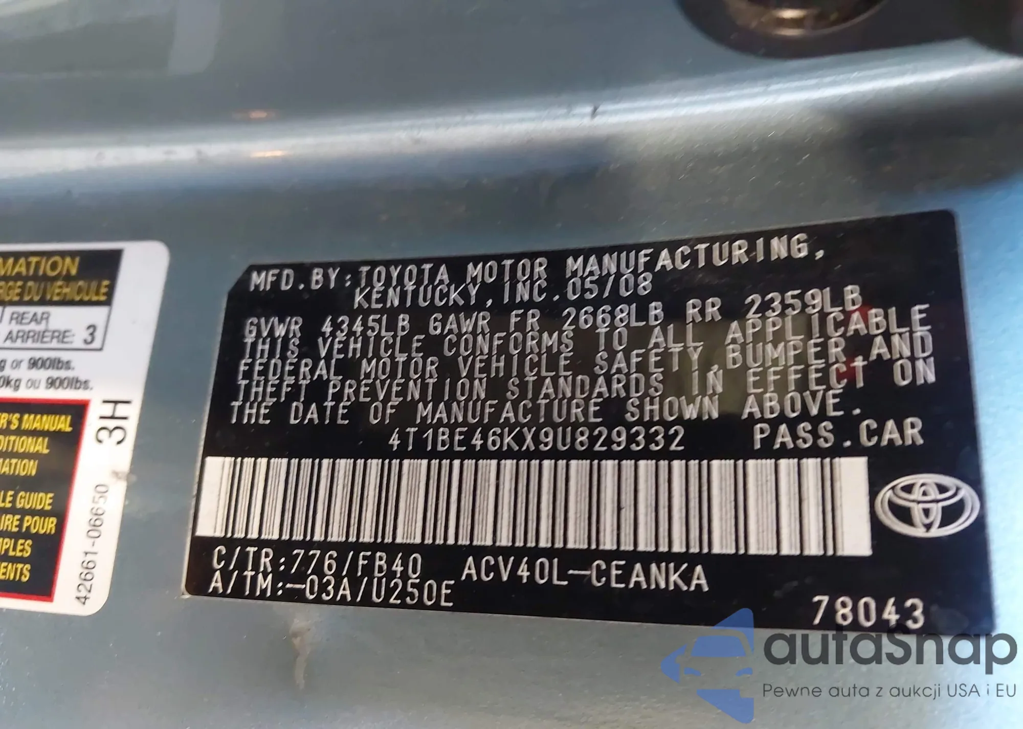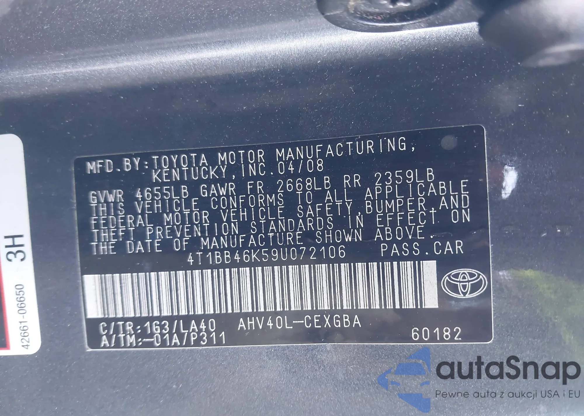 LOT: 43969140 VIN: 4T1BB46K59U072106