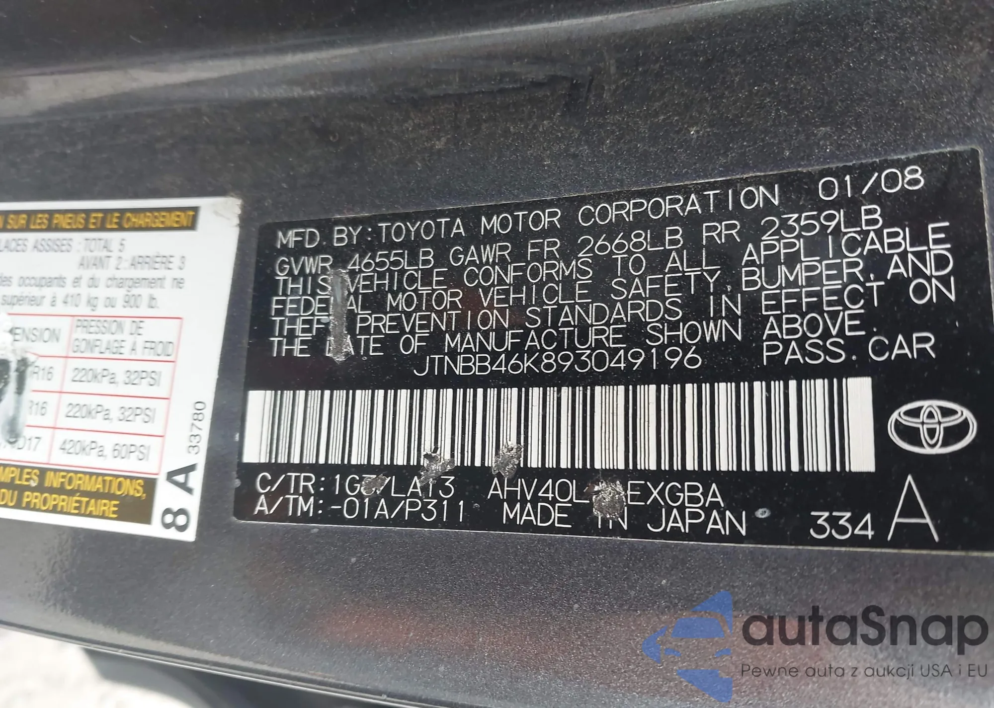 LOT: 44458903 VIN: JTNBB46K893049196