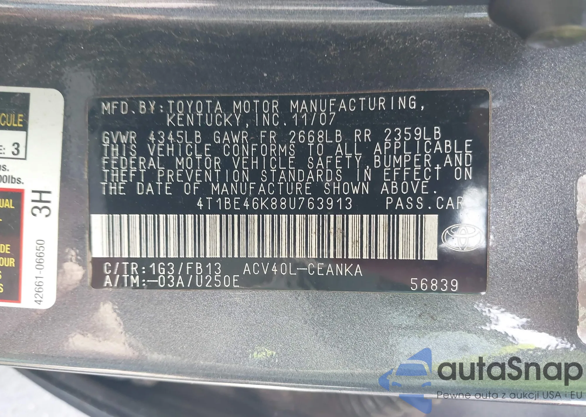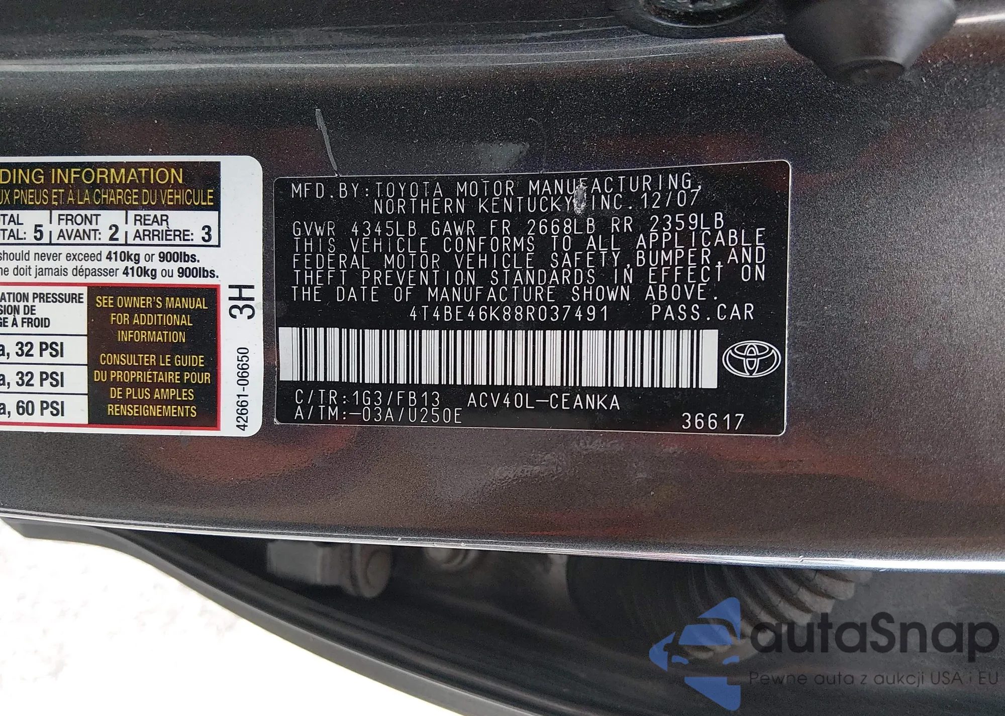 • VIN 4T4BE46K88R037491