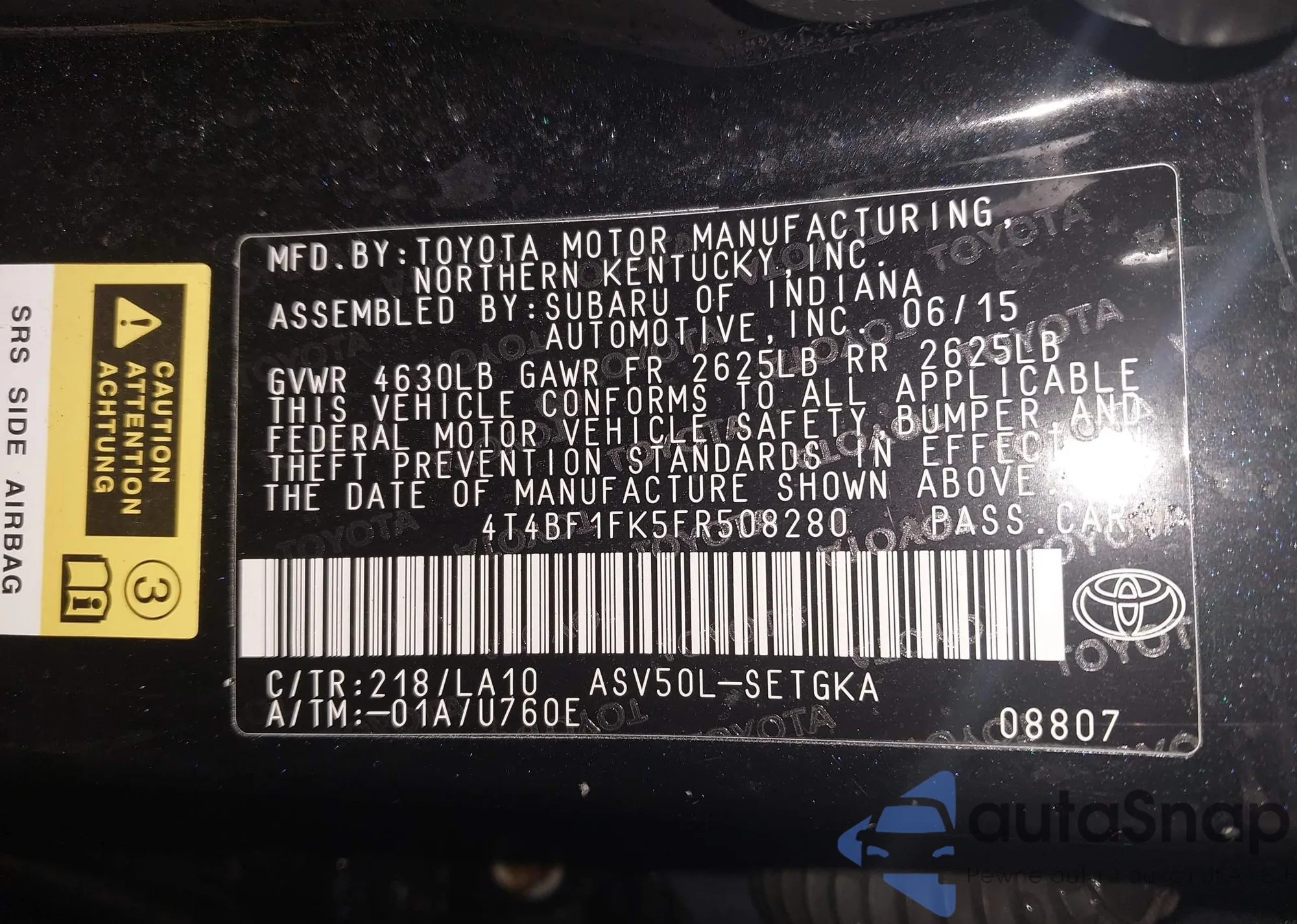 • VIN 4T4BF1FK5FR508280