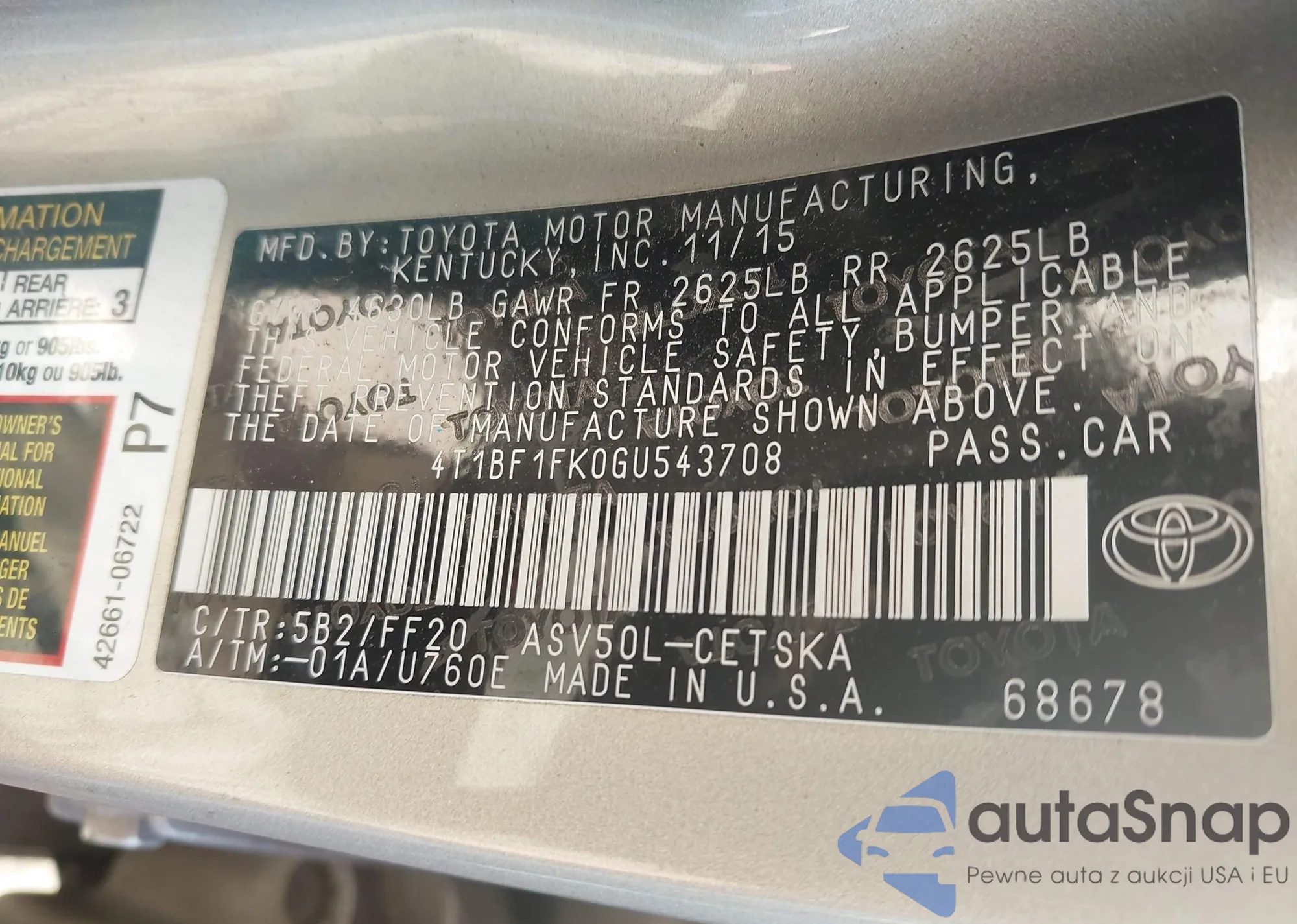 • VIN 4T1BF1FK0GU543708