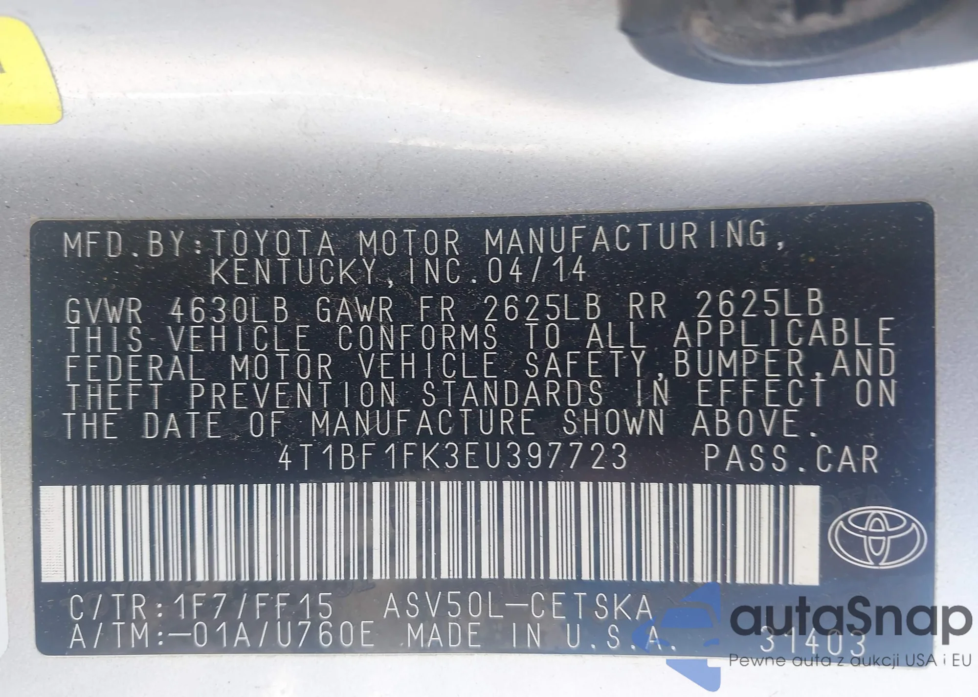 • VIN 4T1BF1FK3EU397723