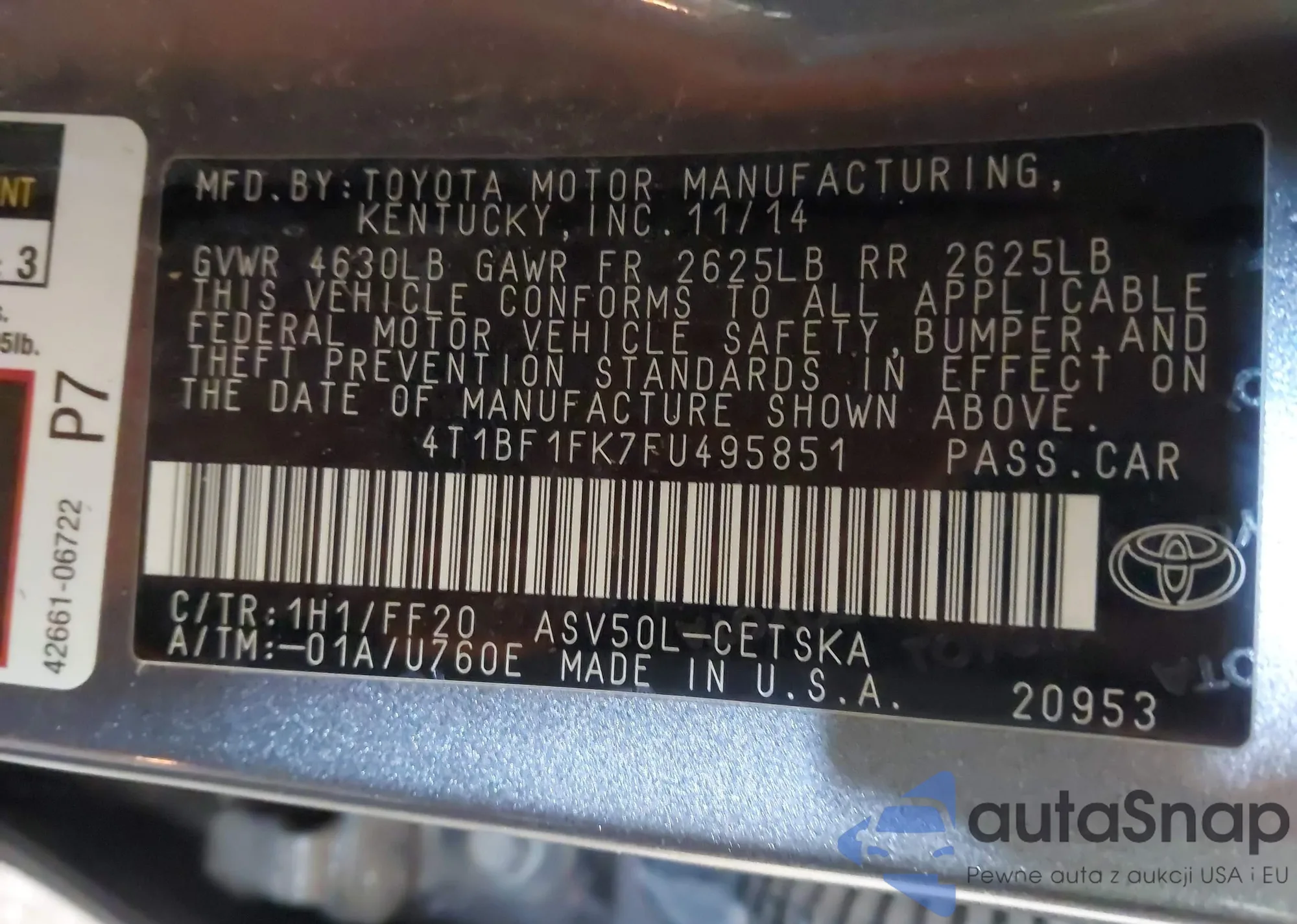 • VIN 4T1BF1FK7FU495851