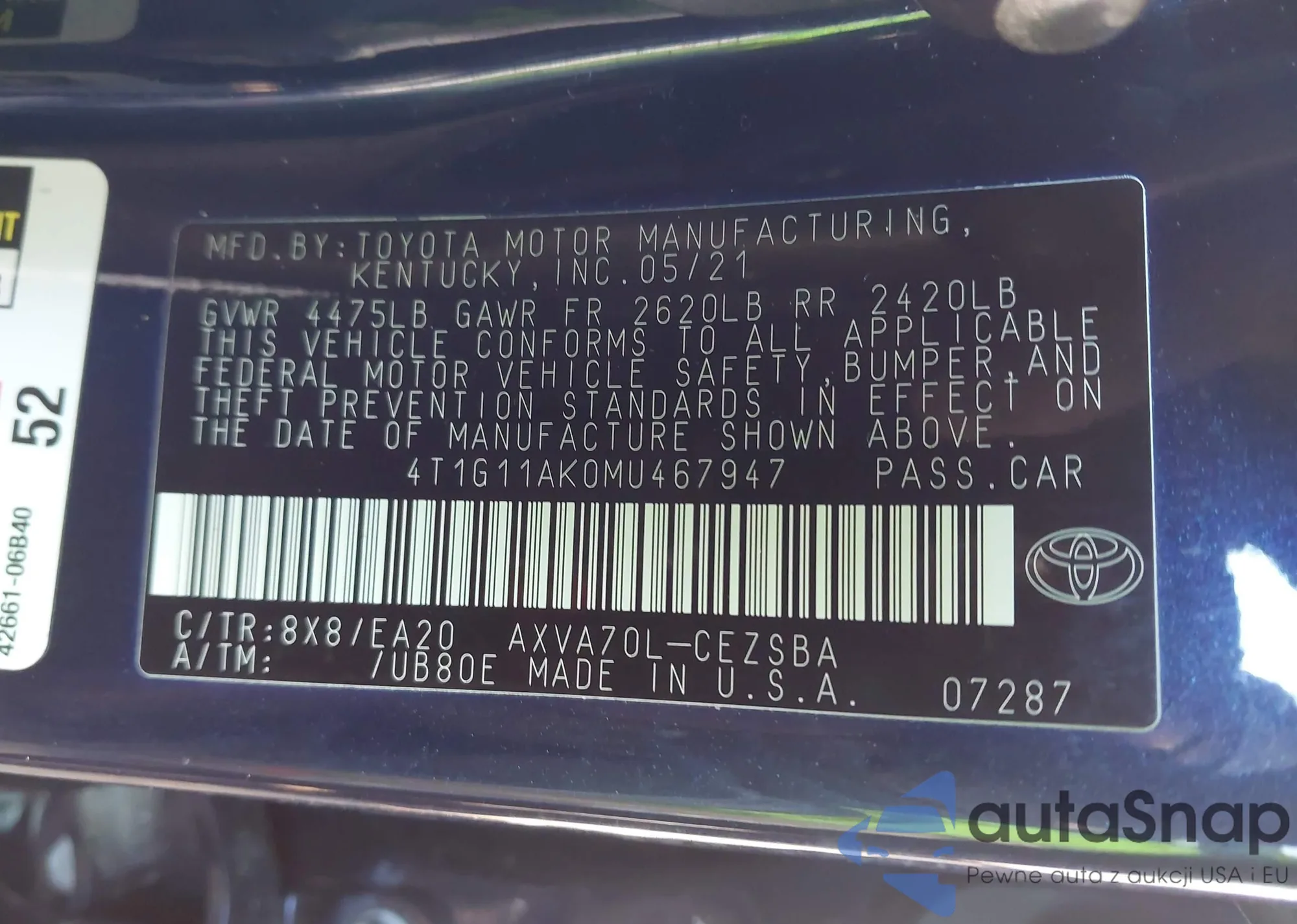 LOT: 43407573 VIN: 4T1G11AK0MU467947
