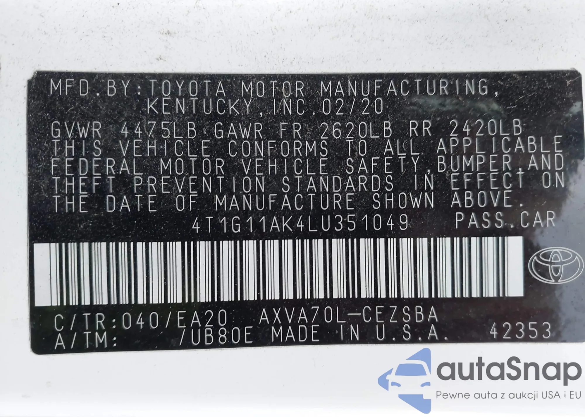 • VIN 4T1G11AK4LU351049