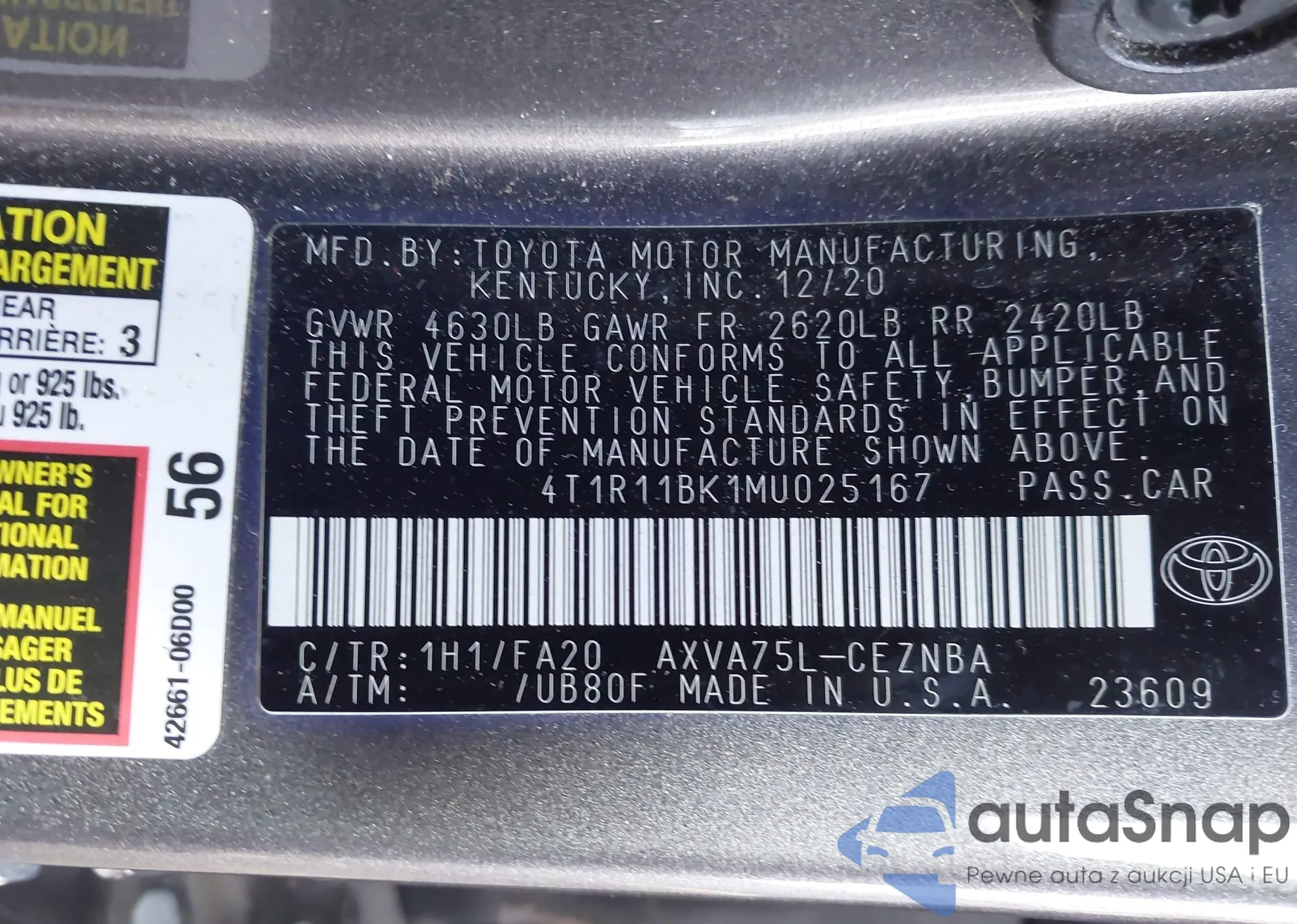 LOT: 44051344 VIN: 4T1F11AK5MU437788