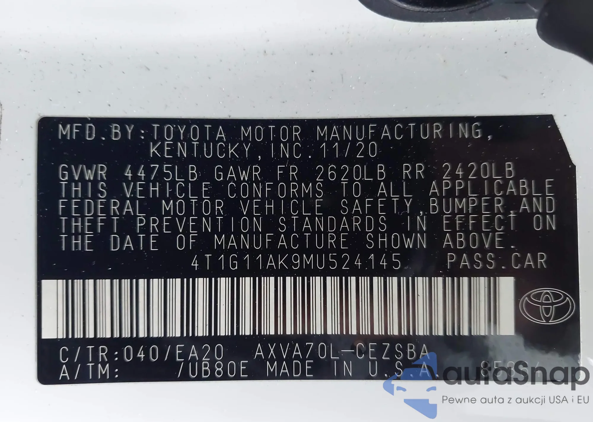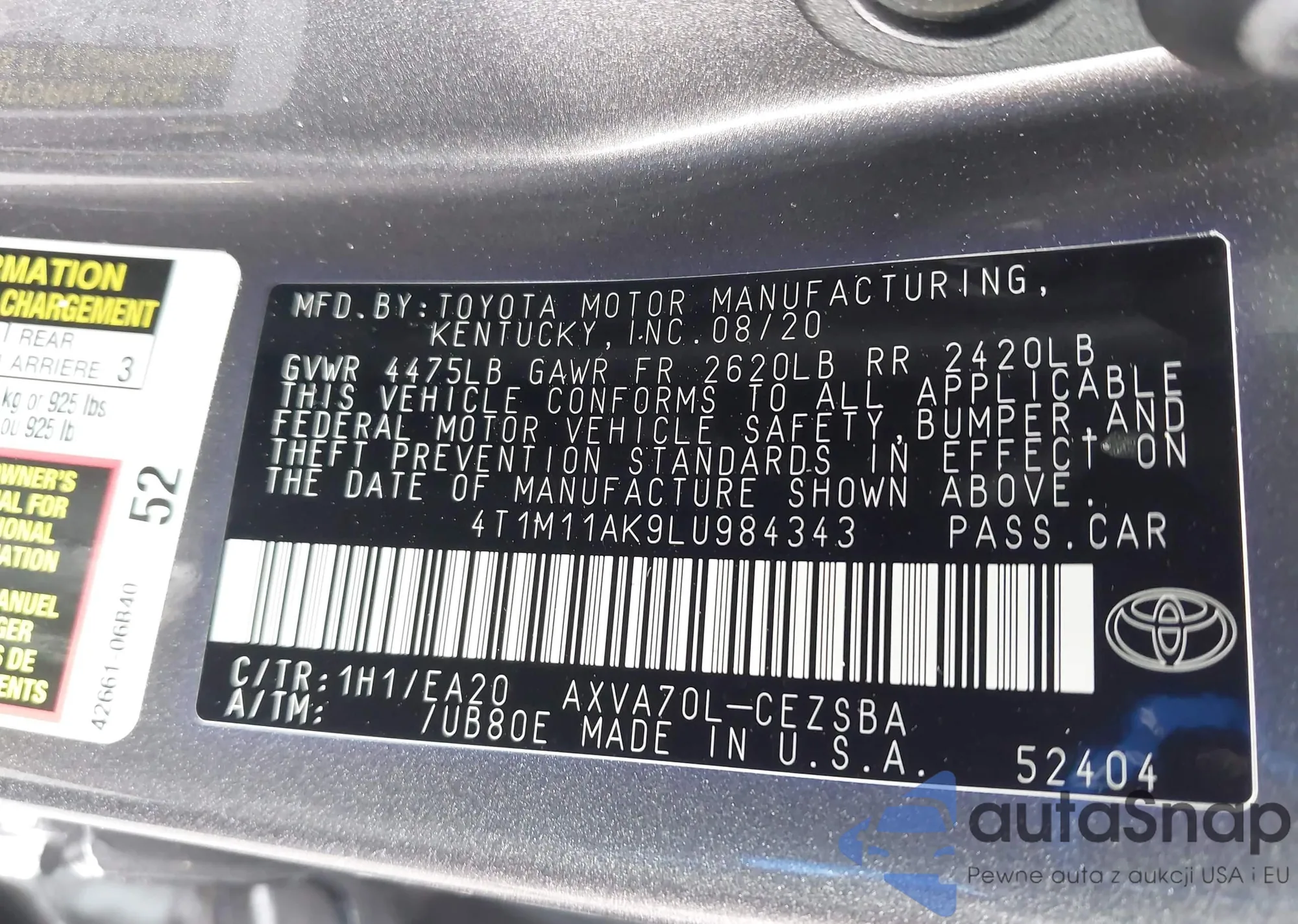 LOT: 97301275 VIN: 4T1F31AK3LU524534