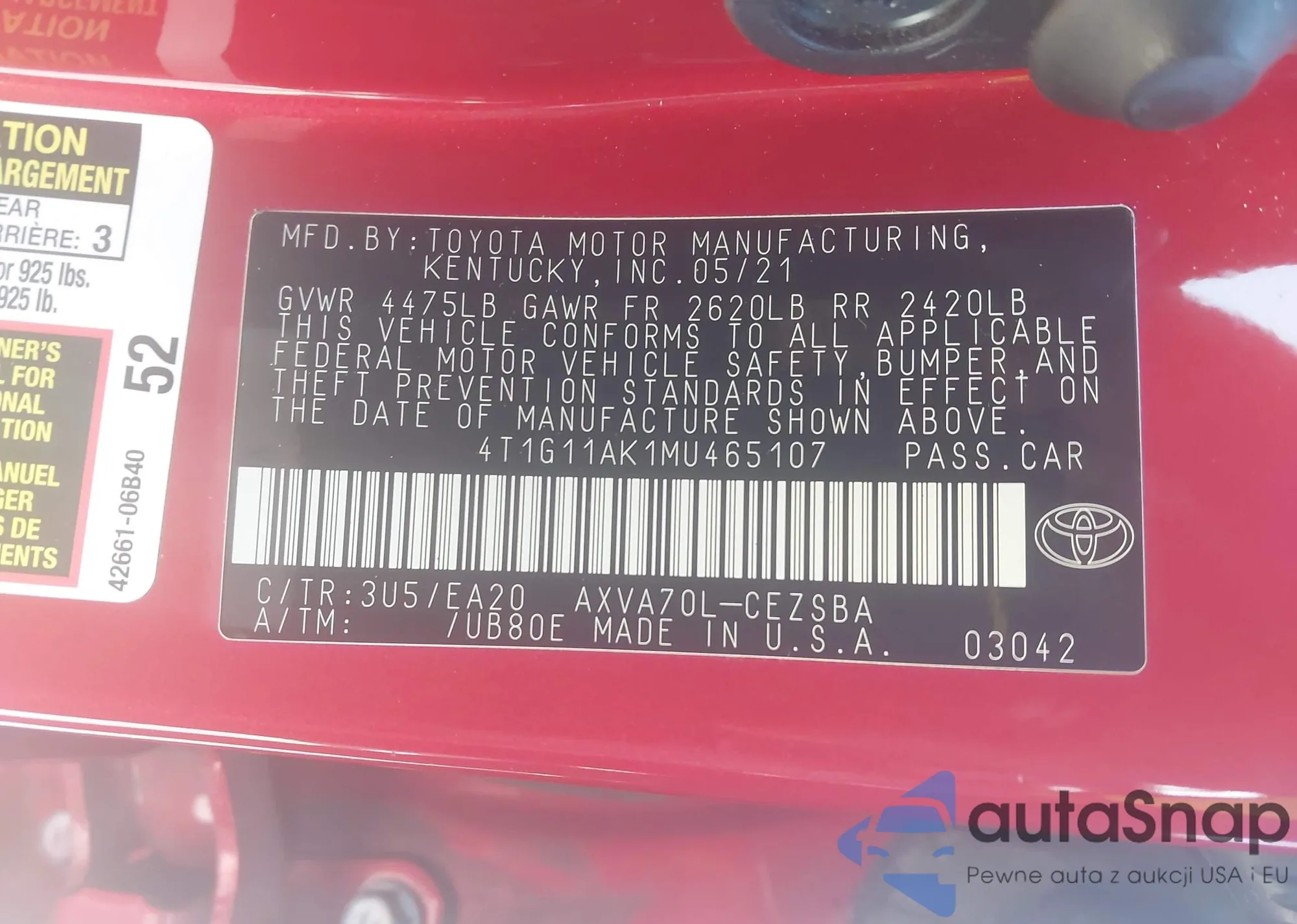 • VIN 4T1G11AK1MU465107