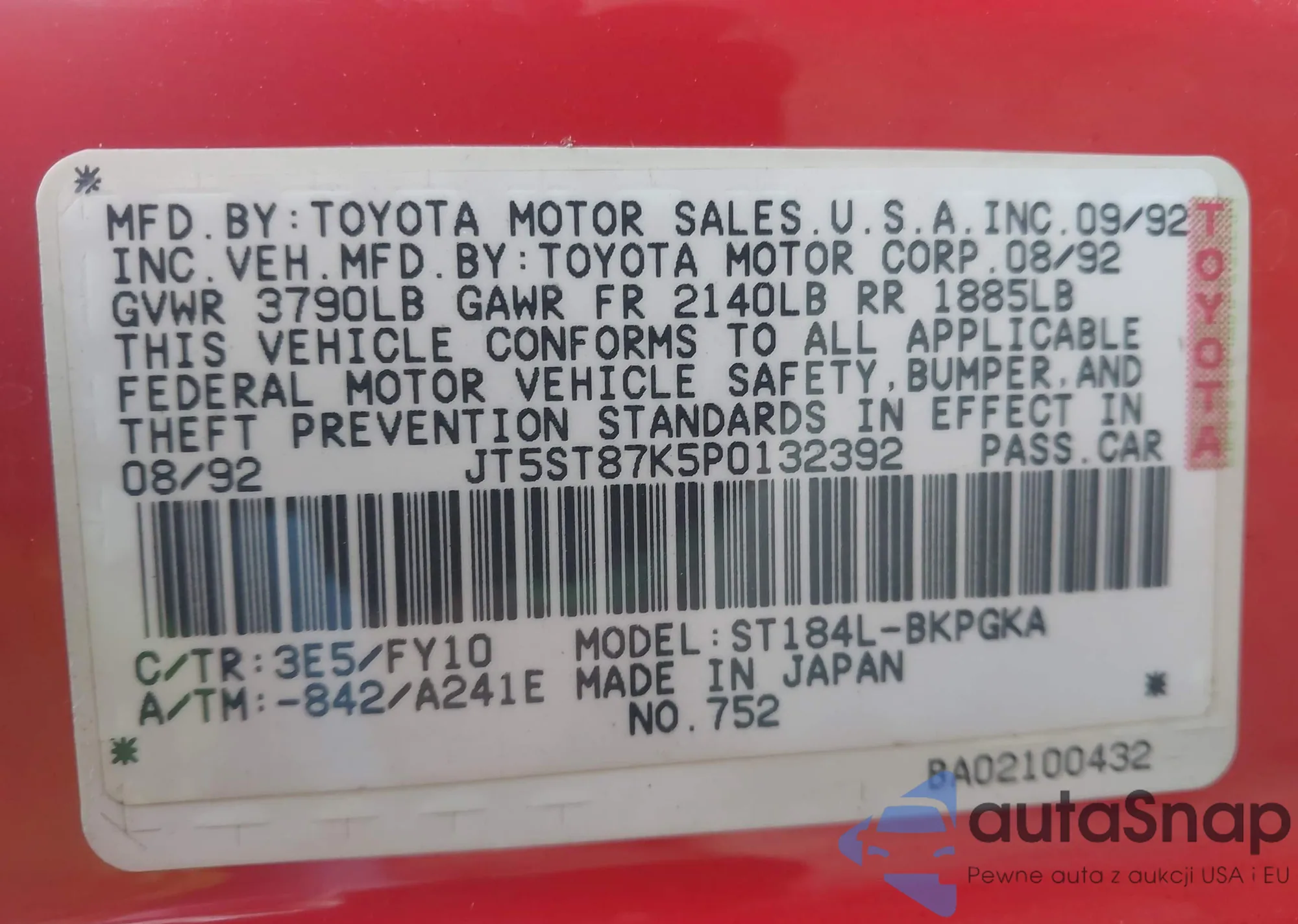 LOT: 44413602 VIN: JT2ST87F5P0145983