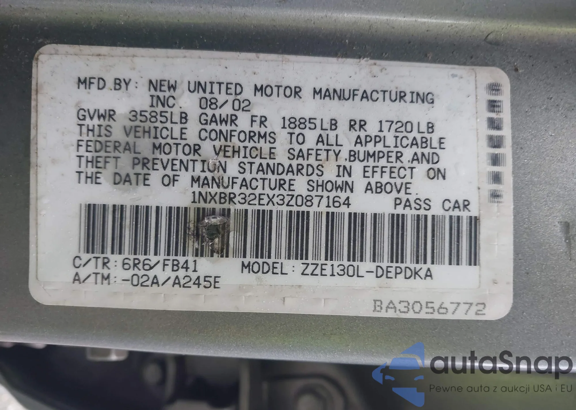 • VIN 1NXBR32EX3Z087164
