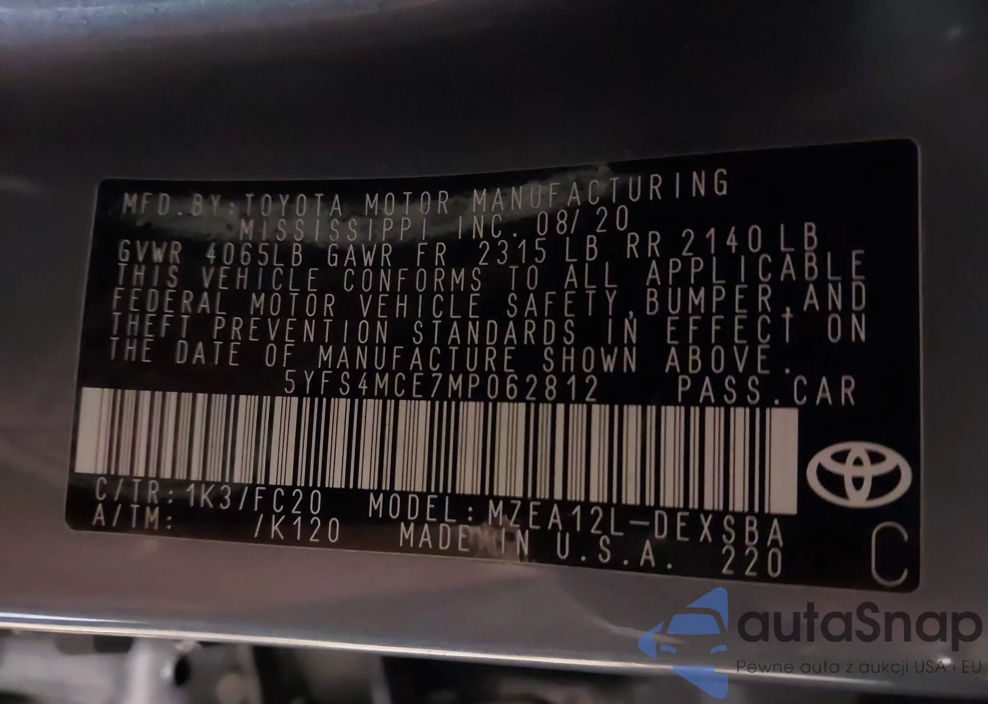 LOT: 43798718 VIN: 5YFS4MCE7MP062812