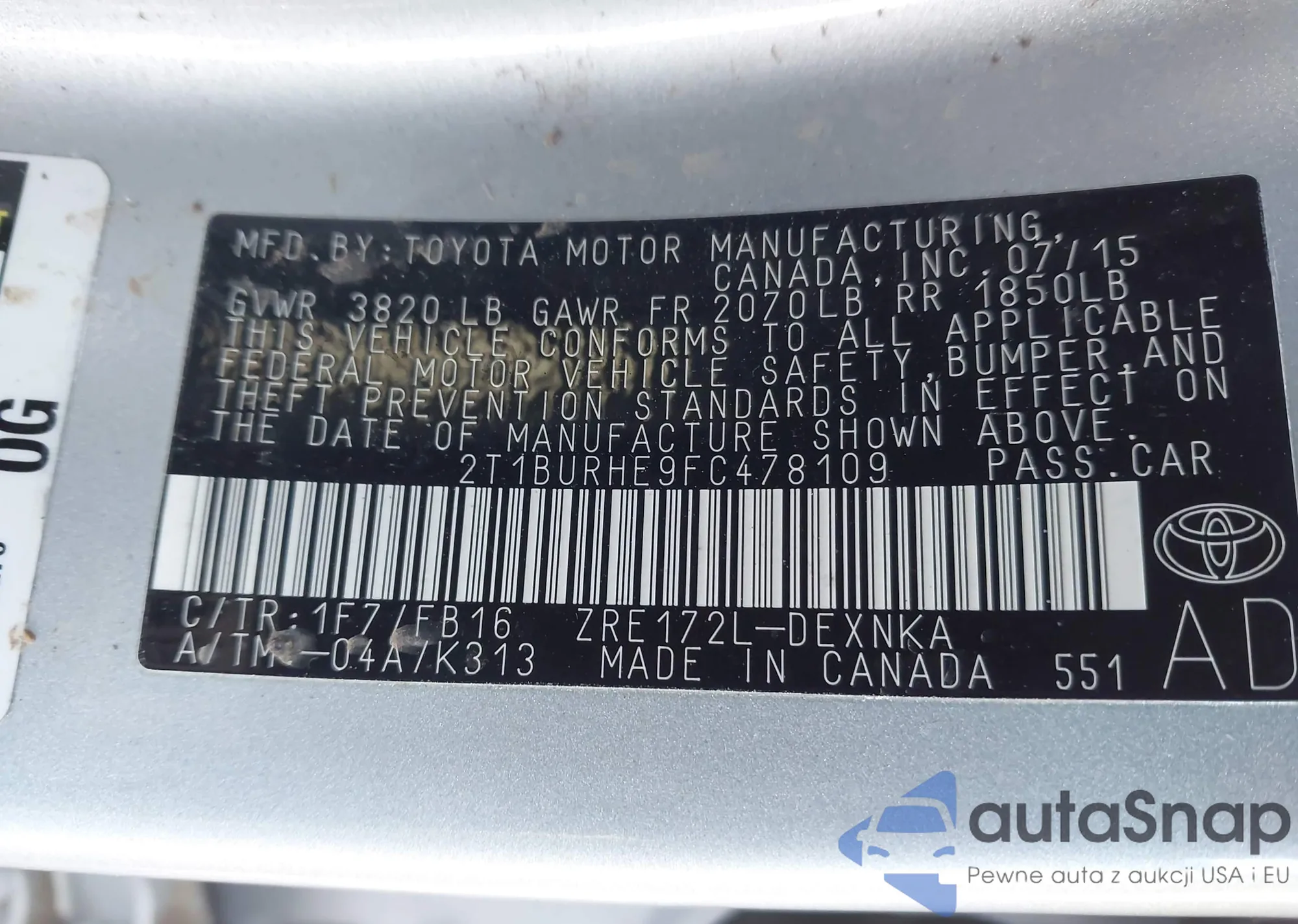 2015 Toyota Corolla Le Plus z USA, uszkodzony, nr VIN 2T1BURHE9FC478109