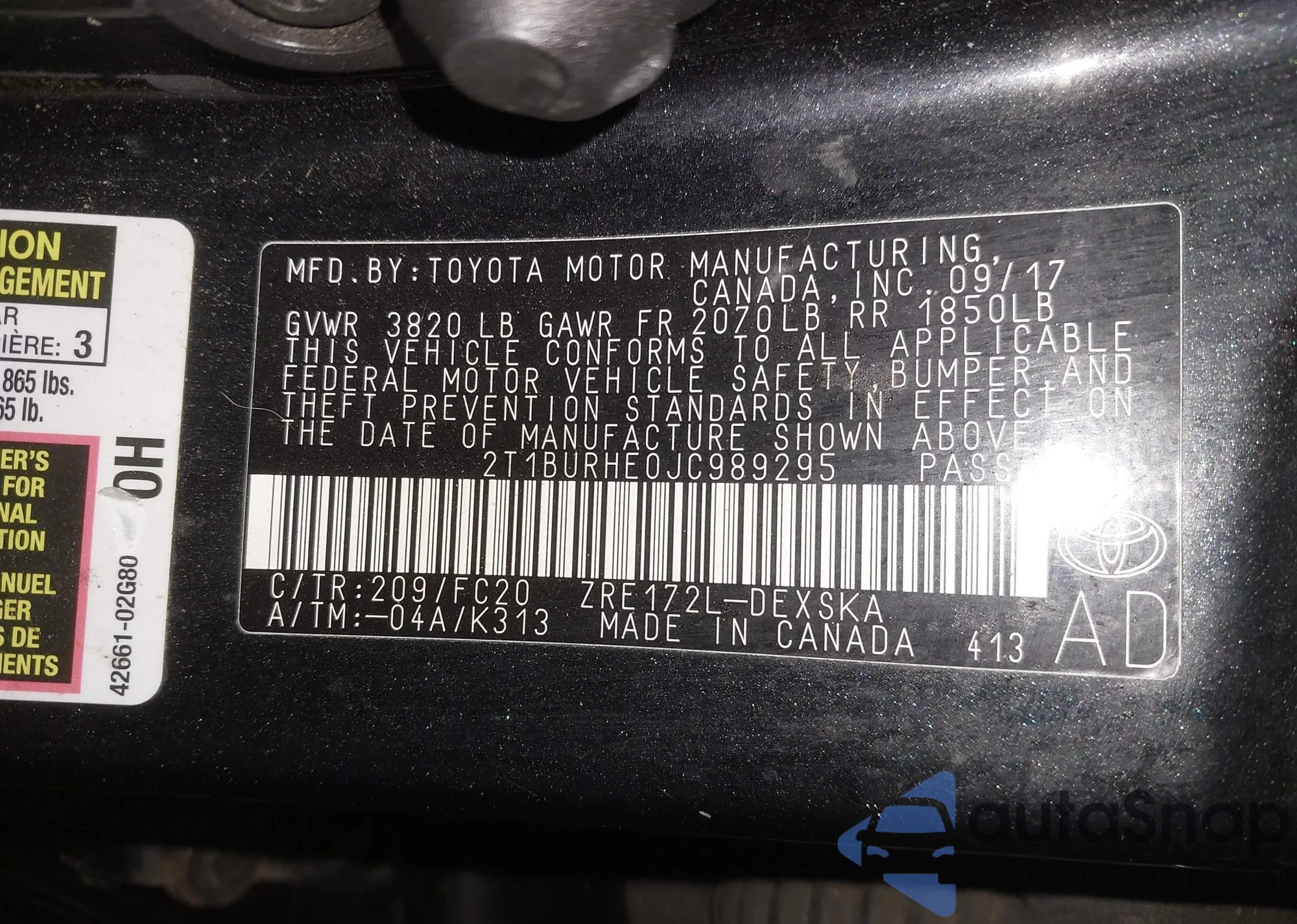 LOT: 43895871 VIN: 2T1BURHE0JC989295