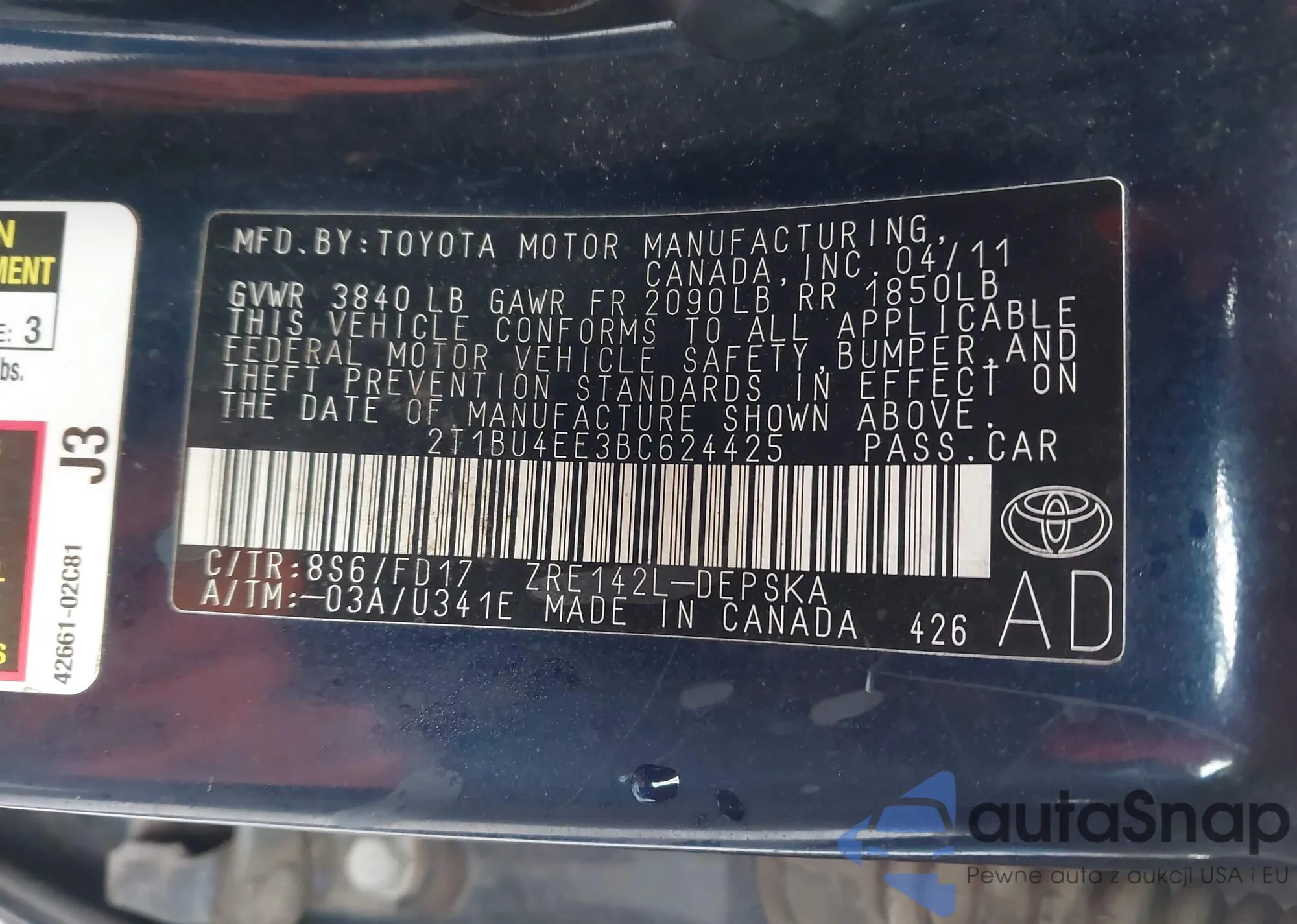 • VIN 2T1BU4EE3BC624425