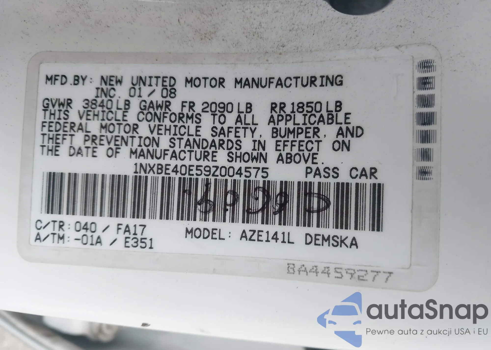 • VIN 1NXBE40E59Z004575